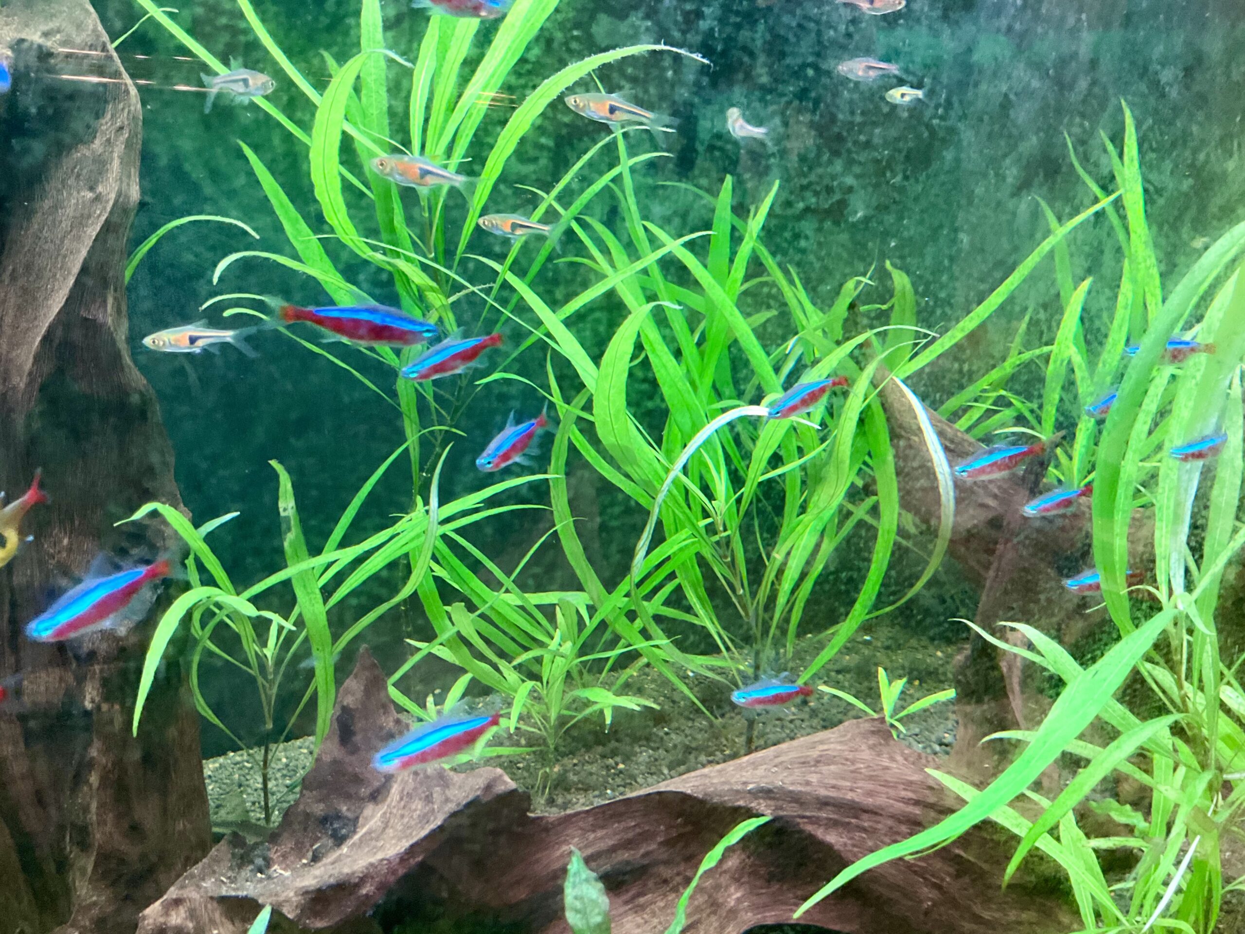 うちの水槽はこの10年くらい、基本的にカージナルテトラという魚がメイン。南米アマゾン原産。昔はネオンテトラという魚がポピュラーだったが、今ではすっかりカージナルテトラが取って代わっている。メタリックブルーのラインが背側、そして腹は鮮やかな赤。小型で温和で水草の中を群泳させるととても美しい。近年は東南アジアでブリードもされているようで価格も安い。熱帯魚の象徴みたいであまりにもポピュラーだけど、これを超える美しさの魚はそうはいない。ポピュラーだけど、これが最高峰みたいな感じ。