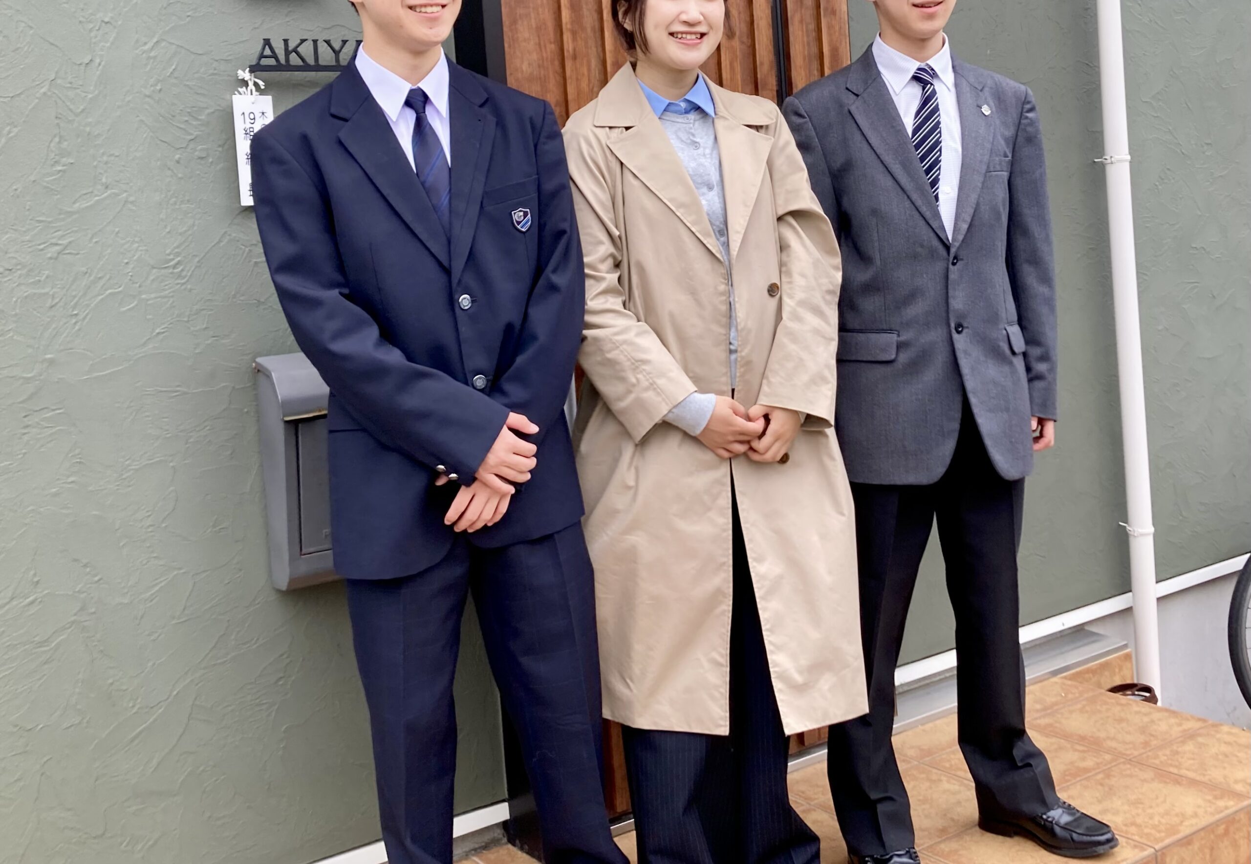 でも長女は7時前に駅に送って欲しいと言うし、双子には初めてのネクタイの付け方を指導しないといけないし、雨も降りそうだし、慌ただしいことこの上ない。かろうじて長女が出る時に家の前で3人で記念写真。
