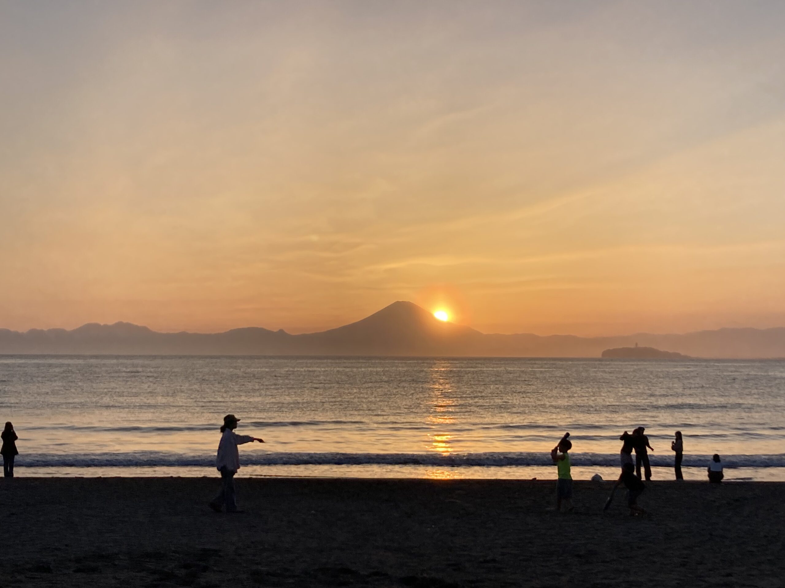 暖かくて夕方の海は人が多かった。ダイヤモンド富士を過ぎて、太陽は富士山の右側へ。次男に硬球を借りて双子2号君とキャッチボールをしてみたけど、滑って軟球より難しい。双子2号君は徐々に感覚を掴んでいたけど、私は最後まですっぽ抜けていた。そして今日もバレーボールをしていたら、右足脹脛が痙攣。年か?(笑)
