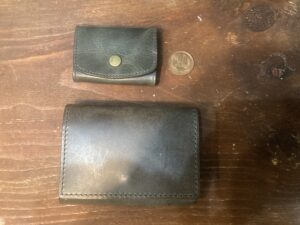 写真だと分かりづらいが、上の小銭入れは緑がかって、下の名刺入れはほんのり青みがかった茶で良い渋みがある。大事に使っていきたい。