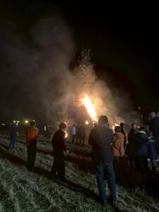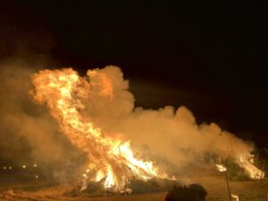 鬼火焚き本編では、年男女・厄のひと10人くらいが代表で棒に焼べた火を、竹の集まりに放ち、またたくまに火が広がっていった。(田んぼの周りでやっていたので、燃え広がる心配はなかった)。豪炎が寒い体をあたためてくれ、燃えて弾ける竹の音が悪い気を祓い、服には煙の匂いが残った。