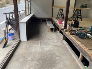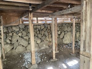 砂利を積載した大型車両は裏手に入っていけないので、玄関の土間に砂利をぶち撒けてから、スコップを用いて隙間から落としていく工法で行われた。なんとも腰を酷使する作業であった。
