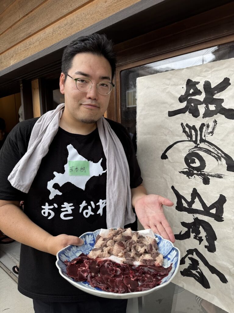 スペシャルゲストでYoutuber 野食ハンターの茸本朗 さんも来てくれた。これは北海道で捕れたトドの刺身と脂身。