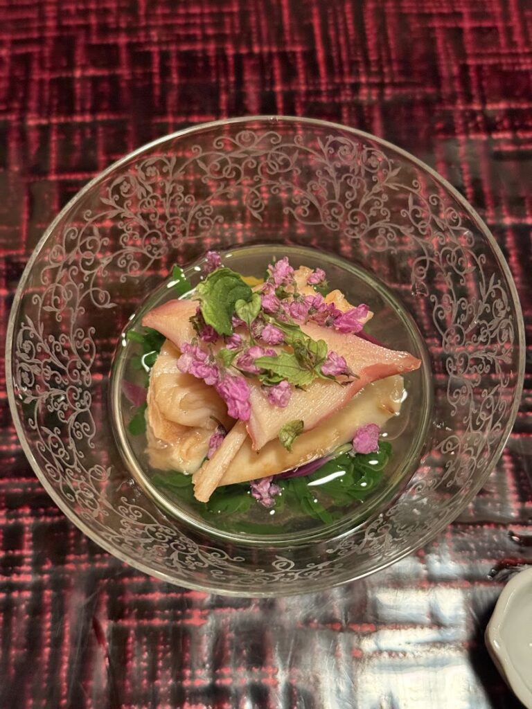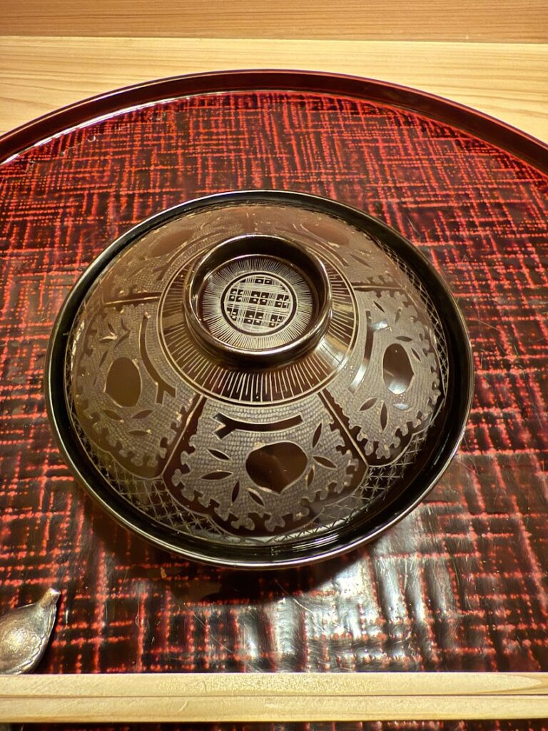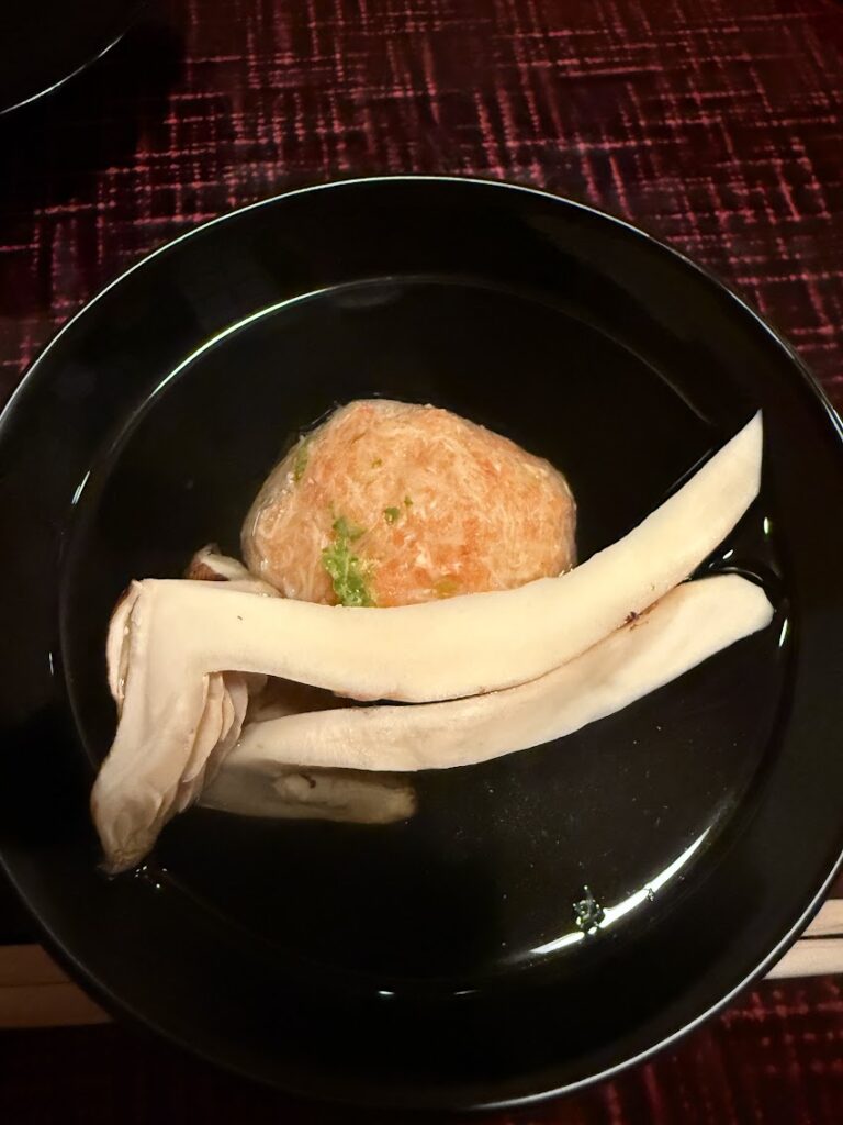一流のお店で使われている漆器椀を体験したいと考えていたら、ご縁があり最高峰のお店に同行することができた。 初手から豪快な松茸のフライ。