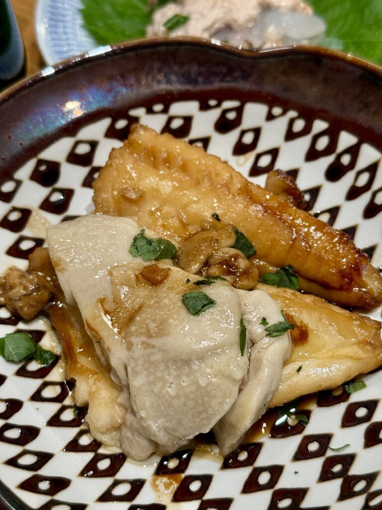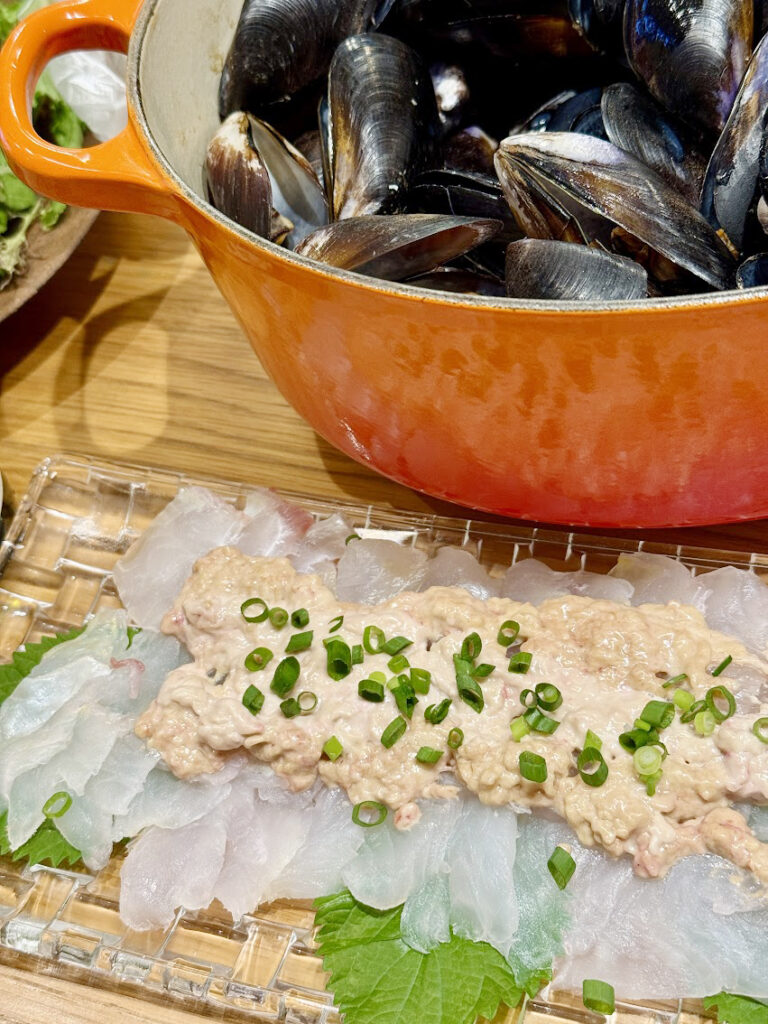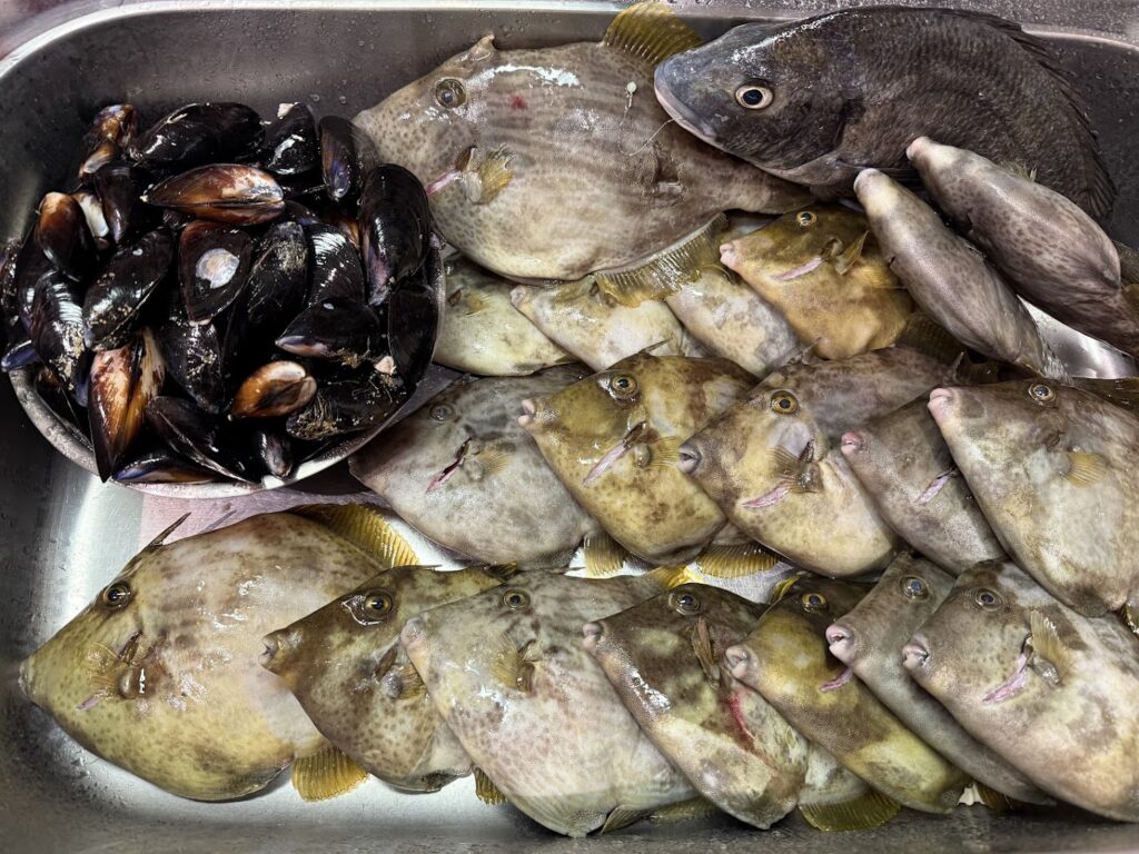餌のムール貝は酒蒸しにして、カワハギは刺身に肝を乗せていただく。