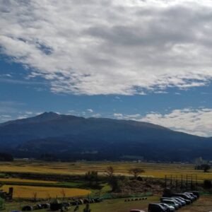 廃校となった小学校を利用して開催されたいちじくいち。この前日に台風が直撃、私たちが使う教室のベランダの手すりがもげ、並びの教室の手すりも繋がってだらんと宙ぶらりんになっていた記憶がある。そのベランダから撮った鳥海山。