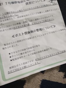 昨夜2週間弱の旅から帰宅。ポストに入っていた大量のチラシや郵便物の中に団地のお便りが。