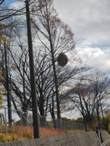 十数年に渡りチェックしているヤドリギ。冬になって葉が落ちるとよく見える。年々大きくなっていて家のベランダからでも見える。
