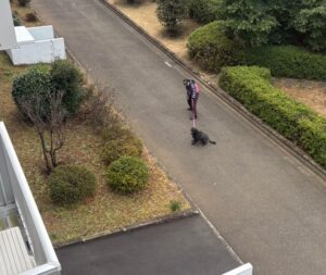 朝の散歩。おじさん(だんなさんのこと。私のことは“おばちゃん”と認識)が家にいるので、おしっこだけして散歩に行くのを嫌がり家に戻ろうとしているところ。散歩はあまり好きじゃない。3人一緒だと仕方なく歩く感じ。