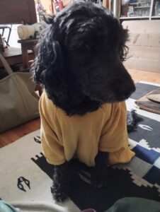 6時過ぎ、寝起きのクーラ。昨日の夜お風呂に入れたら、寝る時に寒そうだったので服を貸してあげた。まだ眠そう。ごはんとトイレを済ませ、仕入れに付き合ってもらう。今日の予定は3カ所。