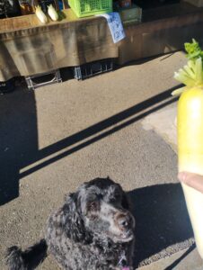 おじさんが卸屋さんで商品を選んでる間、近所の無人販売で大根を買うクーラ。