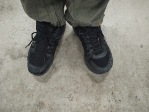右足は普段作業用に履いている、壊れかけのドイツ軍トレーニングシューズ。デパートで接客するのに履いていいやつじゃない。