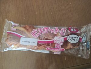 朝昼ごはんにマルダイのでっかい焼きおにぎりと大好きなビスケットパン(秋田のローカルパン)。