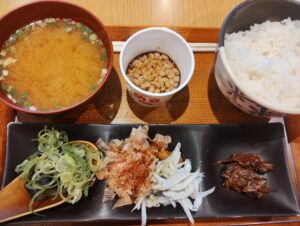 パーキングの朝定食がとても良かった。真ん中のは巨大なしらす。