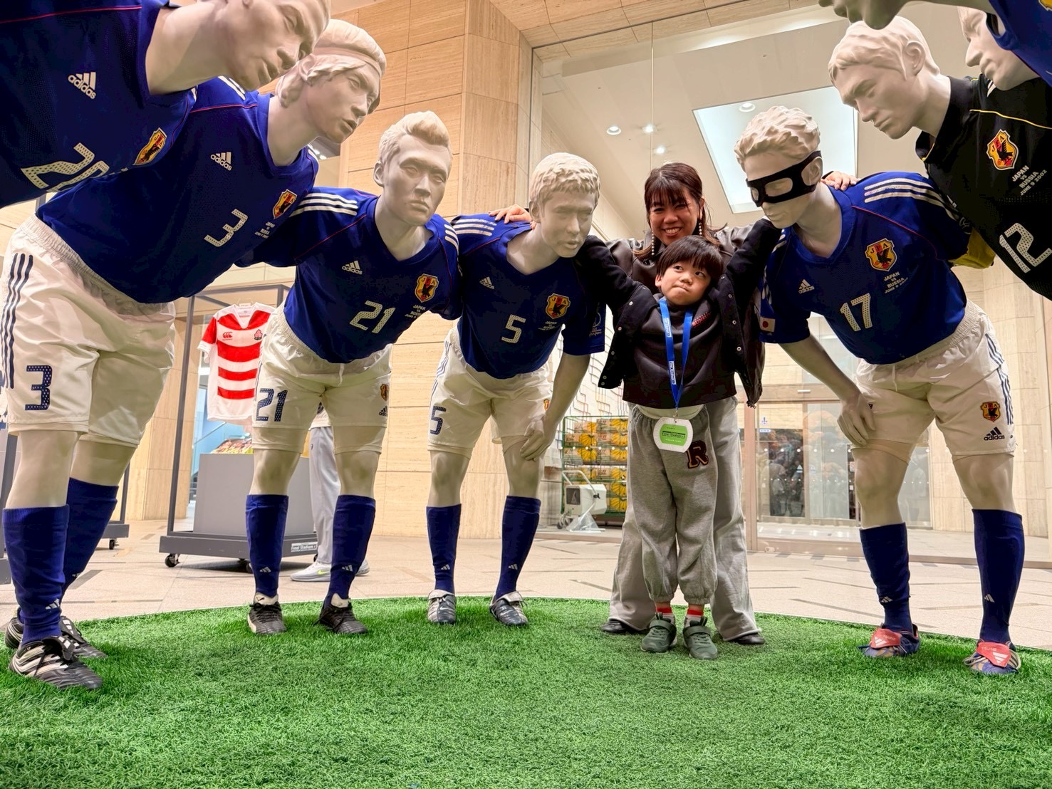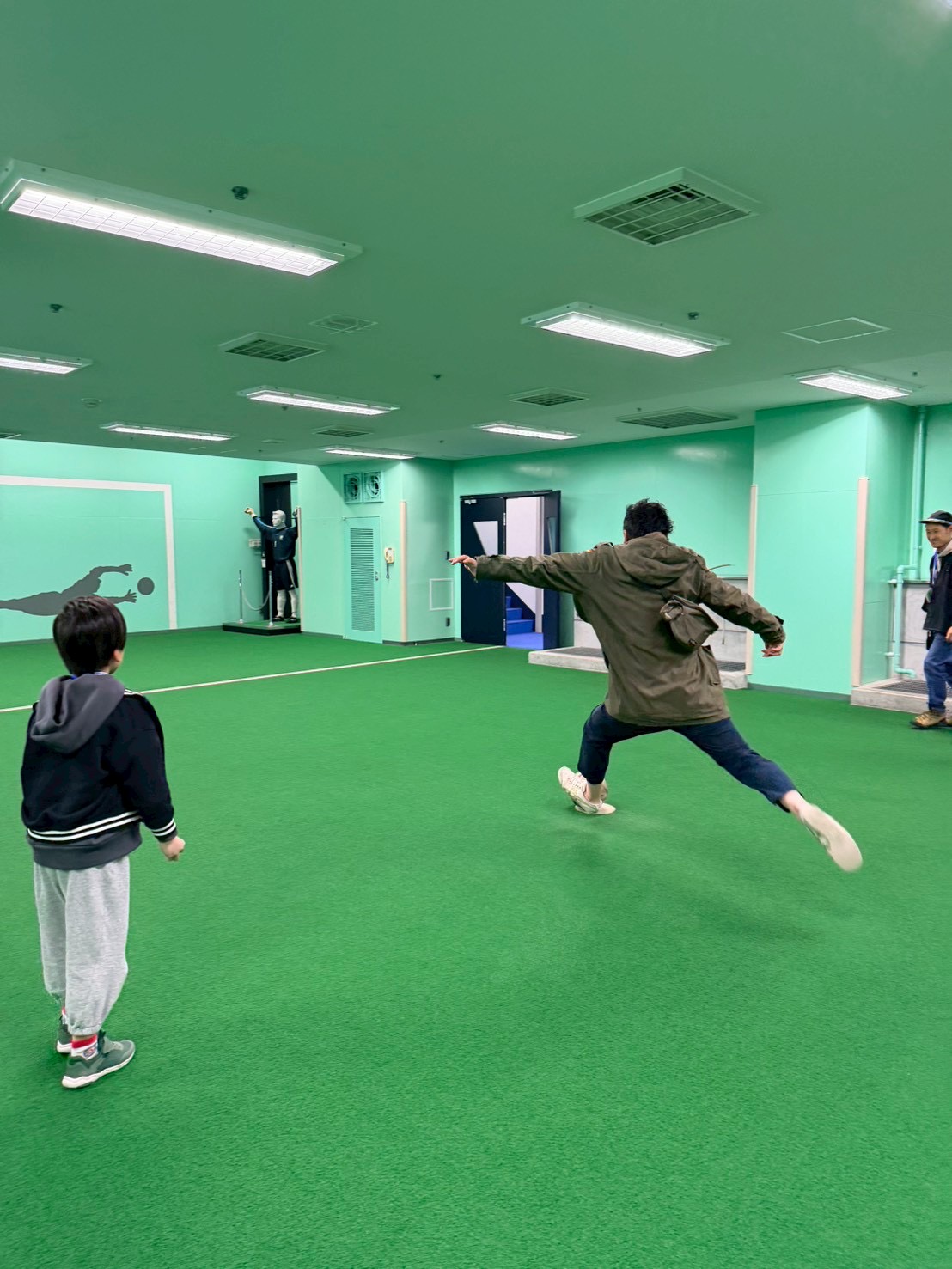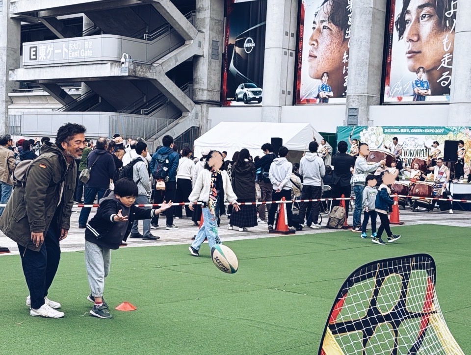 ツアーは15:00〜の回しか無かったのでそれの受付時間までどこで時間潰す?と言ってたらラグビー体験のブースがありボーイを誘って行ってみる。私もラグビーボールに触るの初めて。