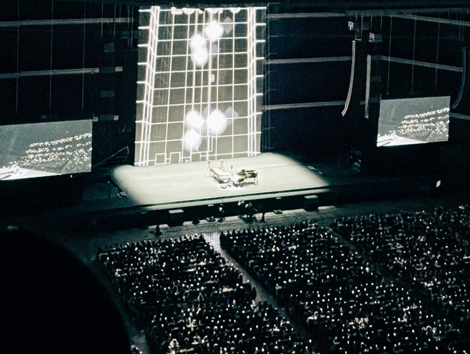 さて、メインイベントであるKアリーナへ。角野隼人氏のピアノコンサート。ステージ中央のグランドピアノの席のあたりを起点に90度の関係でジョン・ケージのプリペアド・ピアノが置かれている。