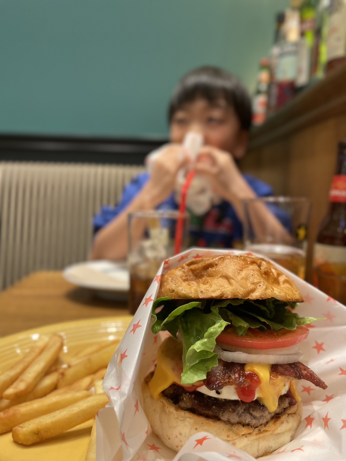 2人してさっぱりして、お昼前だったのでまずはお昼ごはん。ハンバーガーをご所望のボーイ。