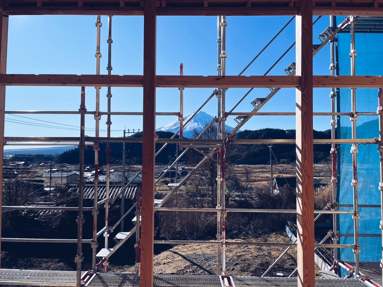 この富士山が見える面はここに写っている柱や梁以外はすべてガラスになる予定。方角的にも富士山は南側にあるので冬は暖かくて良いだろうな。