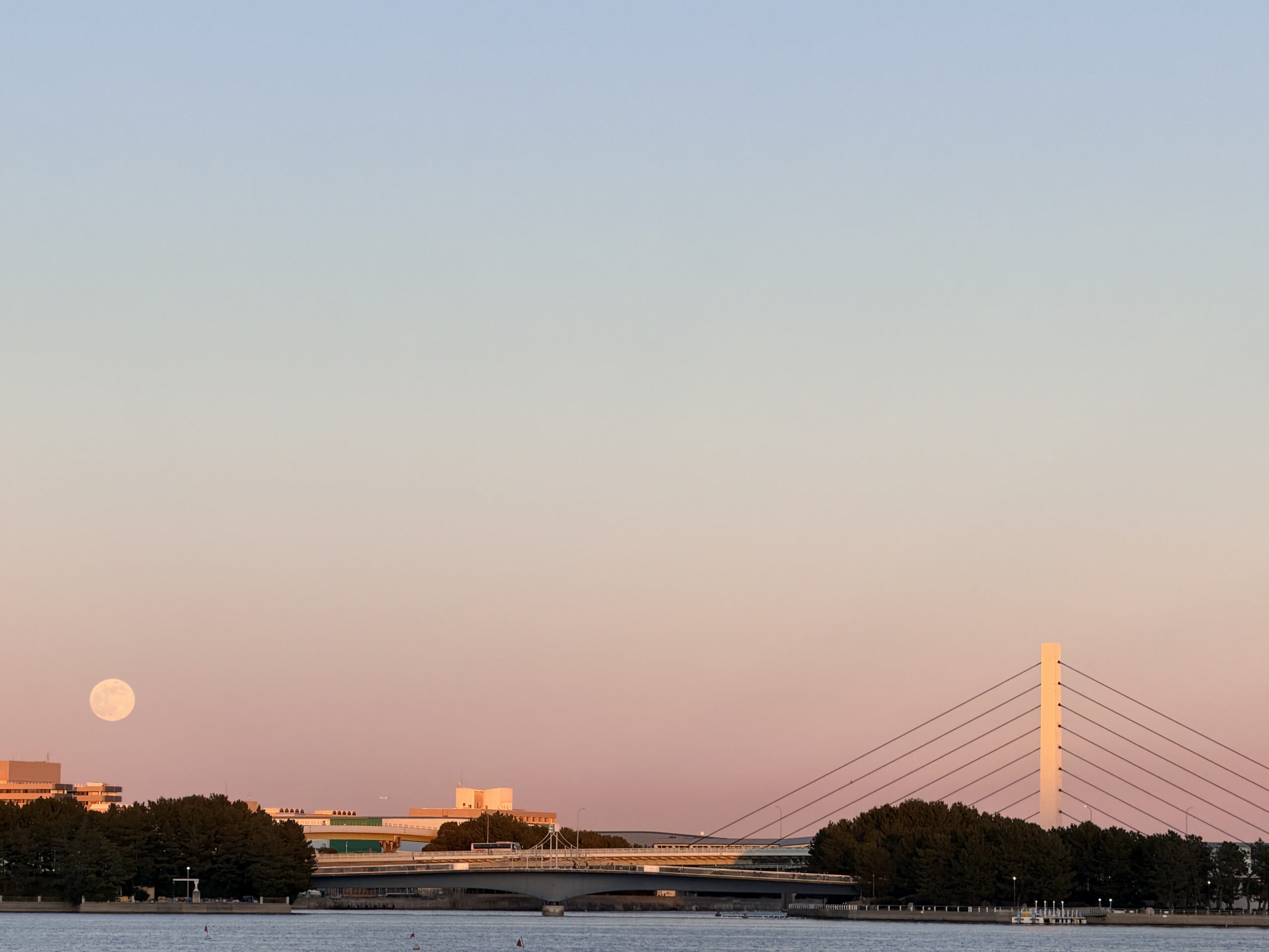 バス停でバスを待っていたら満月が見えて、その下には木星がとても明るく光っていた。