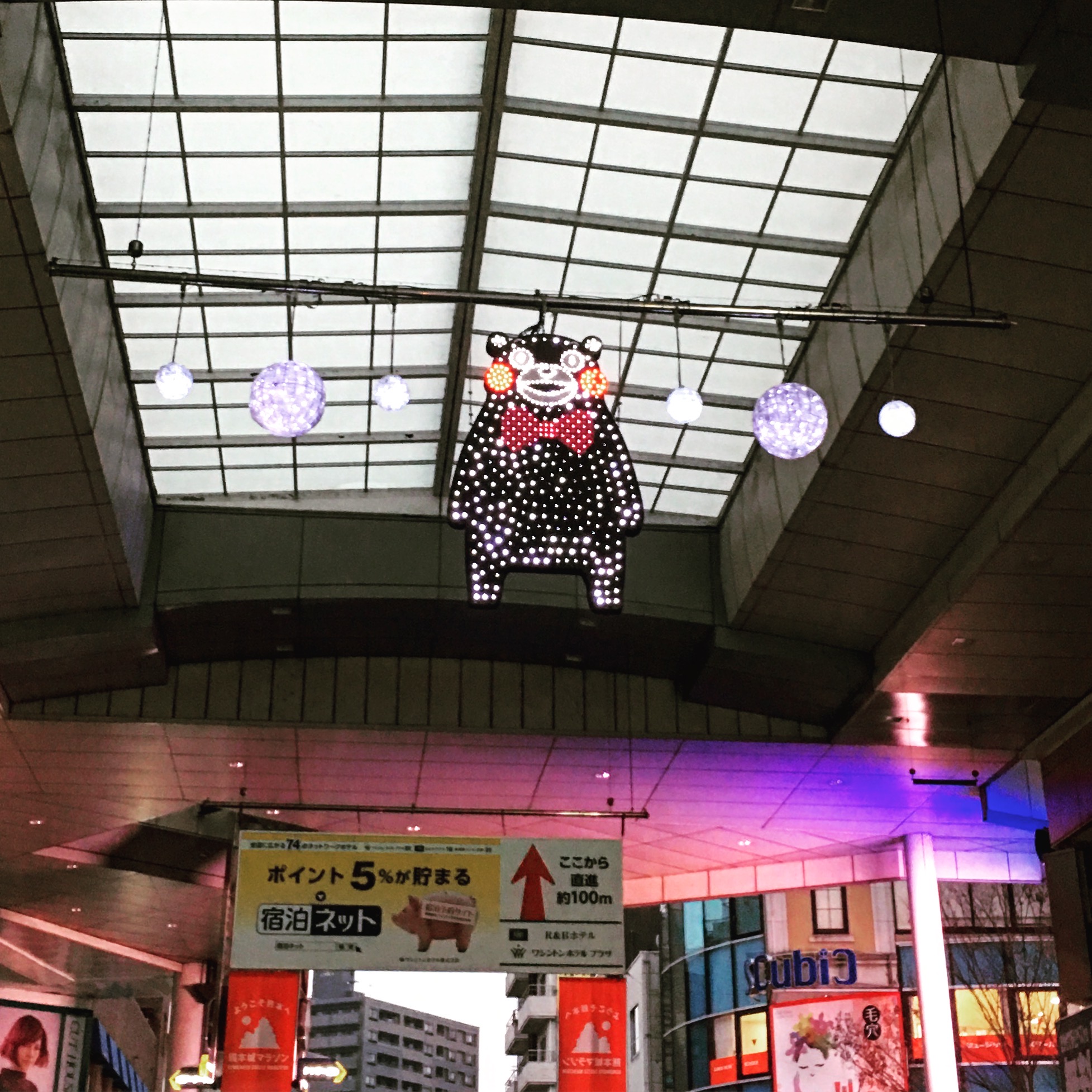 写真は9年前の今日。佐賀の現場に行くのに熊本に泊まったんだった。商店街のアーケードでハンギングくまモン。