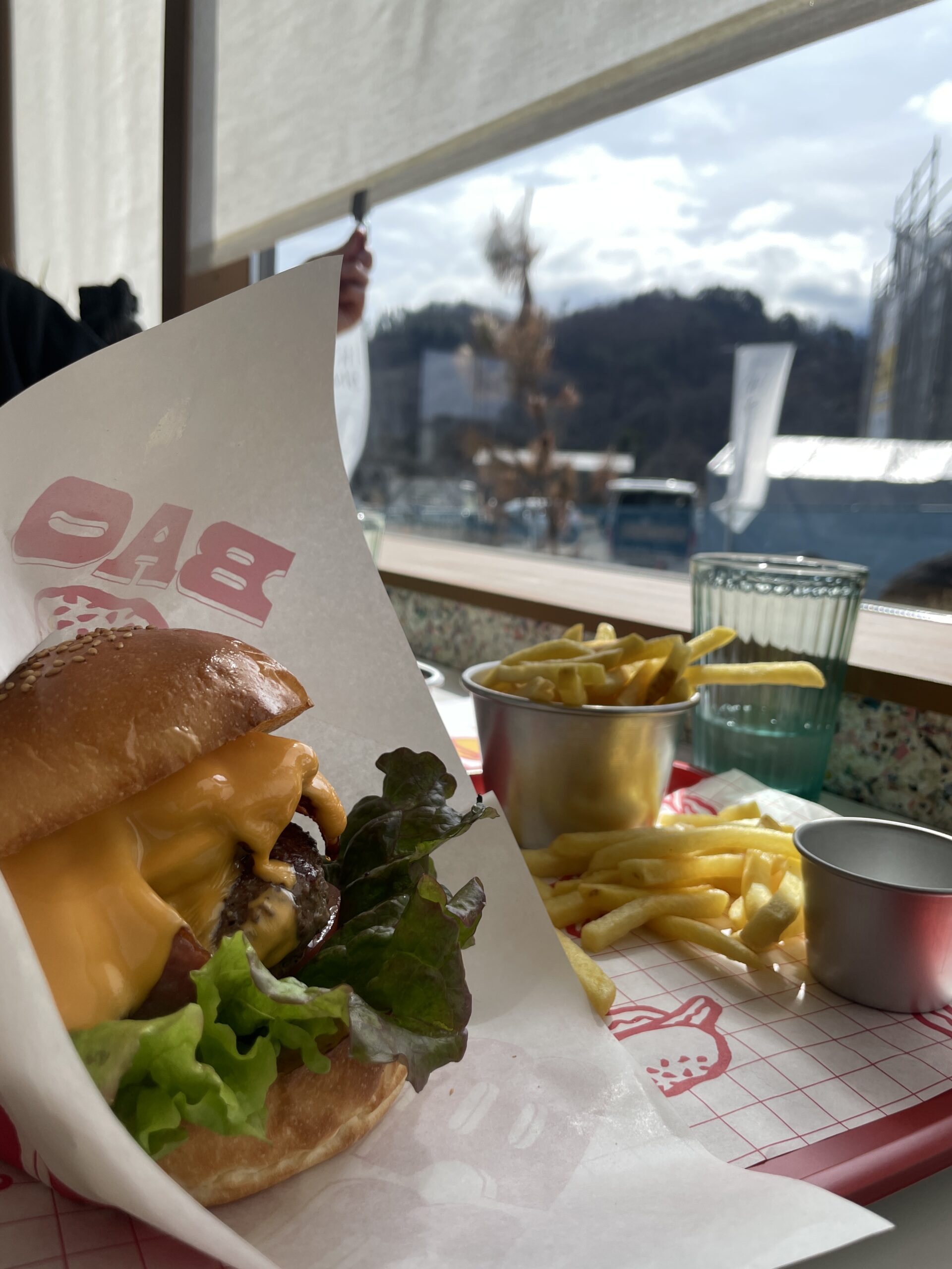 施工中の敷地内で食事したのは初めて。ハンバーガー越しの現場。