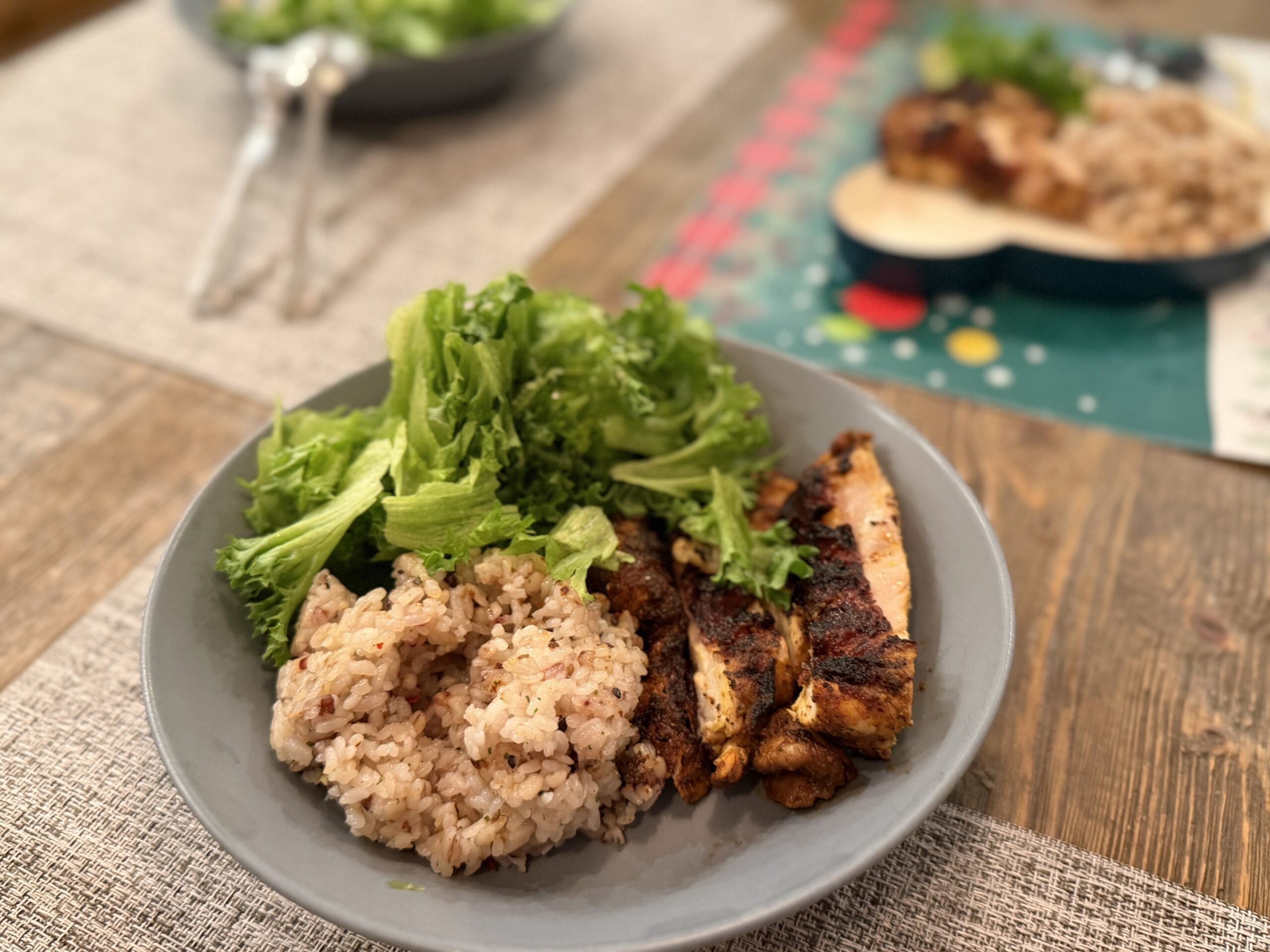 晩御飯はケイジャンチキンとガーリックライス。