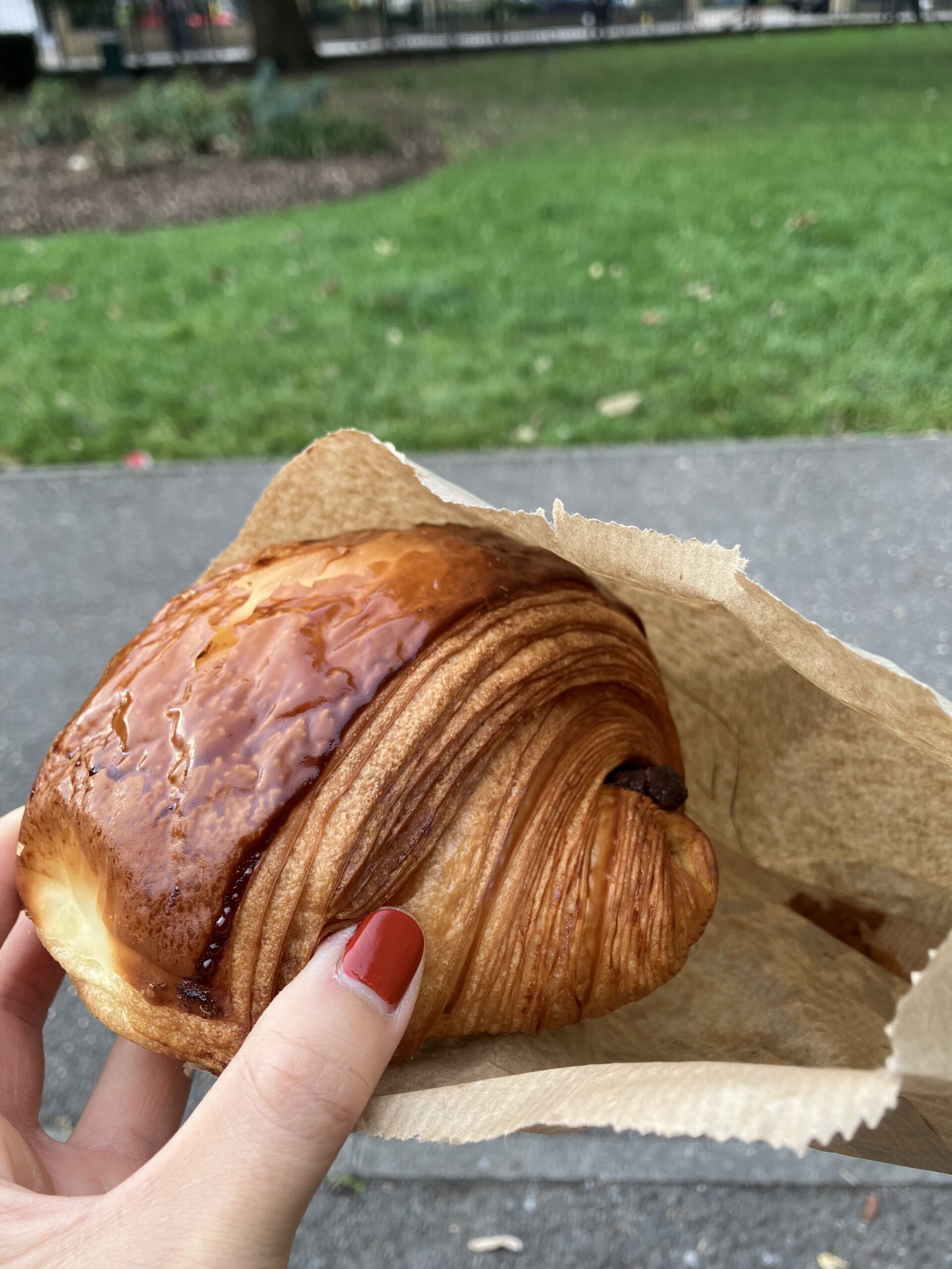焼きたてのパンオショコラ、外はパリッパリ。何層にもなっていて、中はしっとり。