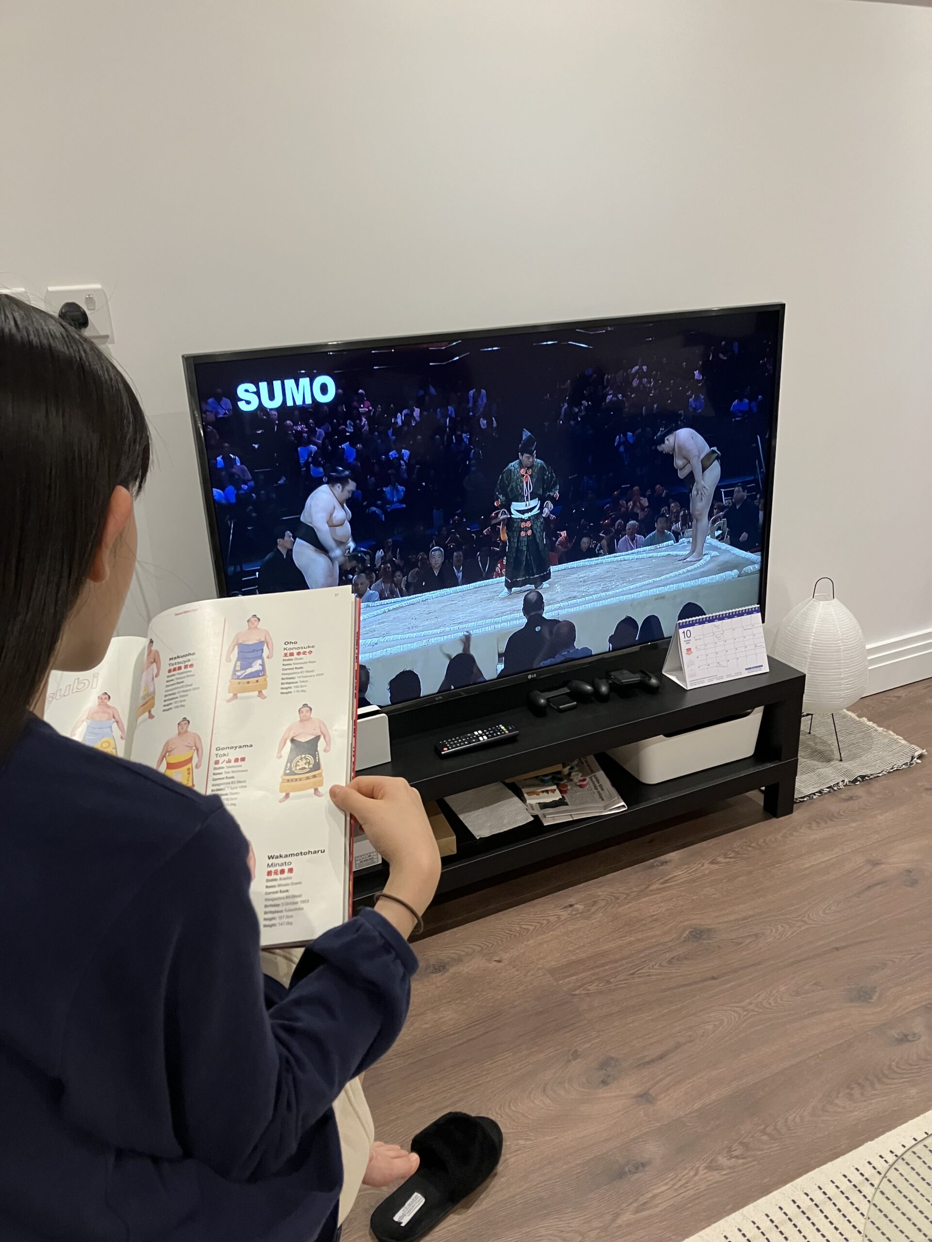 夜は昼間に買ったSumoプログラム片手にBBCのテレビ配信で相撲鑑賞。娘と二人、にわかSumoファンです。