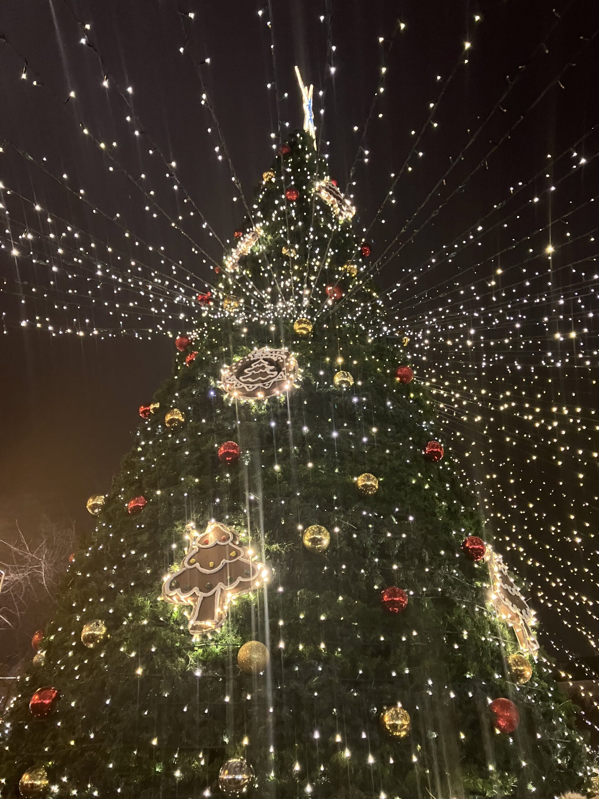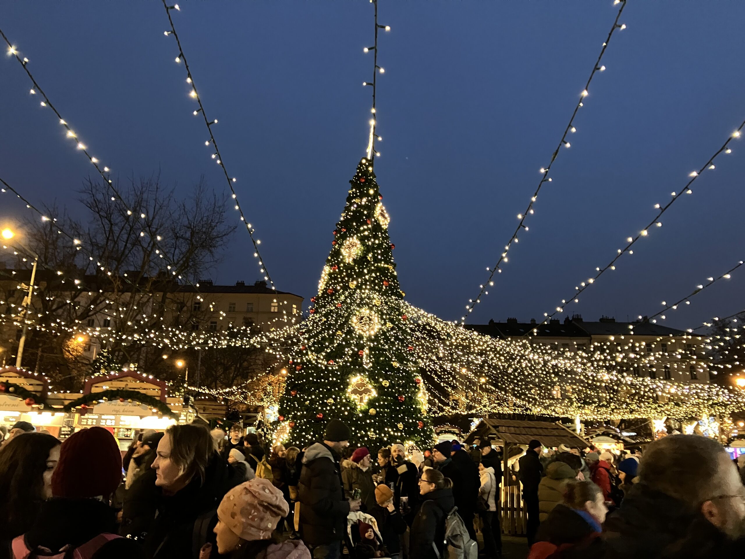 ただいま17:15、聖リュドミラ教会の前のクリスマスマーケットにて,クレープの列に並んでいます。