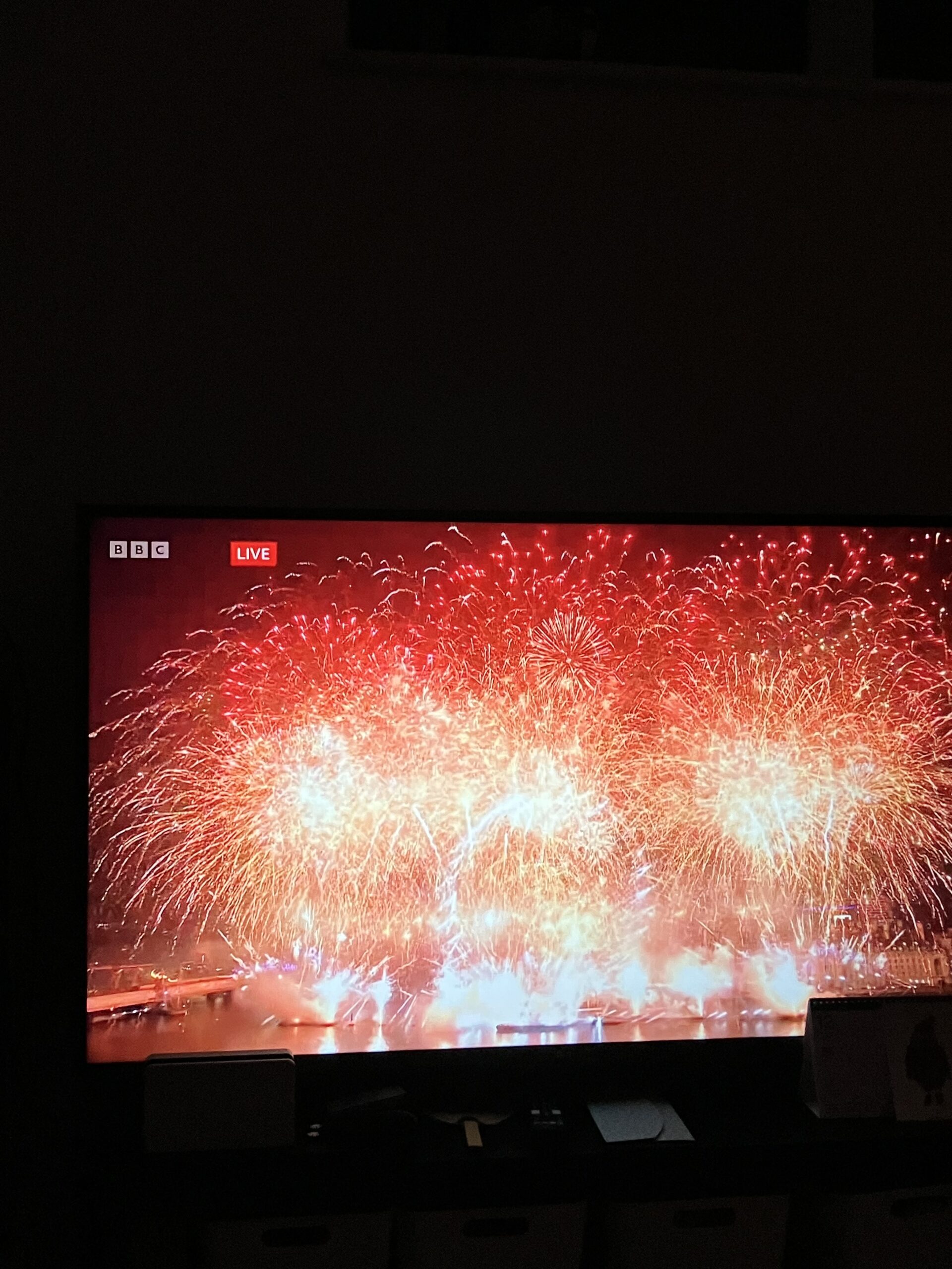 ロンドンアイをメイン会場にしたニューイヤーセレモニーの花火。12時に始まり約12分間の打ち上げは、最初こそ おぉ〜となったけど、後半は子供と「もはや火事じゃん」と失笑。