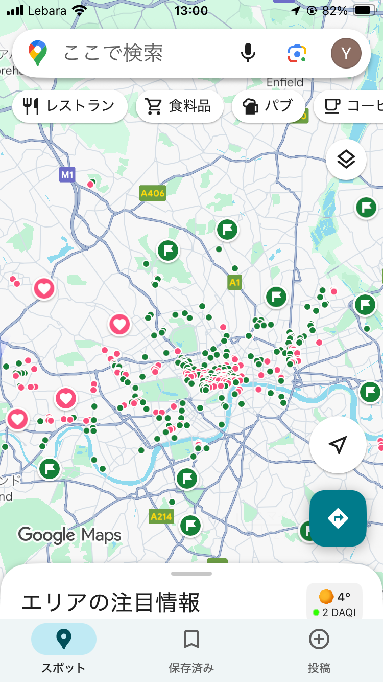 私のGoogleマップはピンを打ちすぎてえらいことになっている。一応グリーンが行きたいところで赤が行ったところだけど、シティの方は濃度濃すぎる!