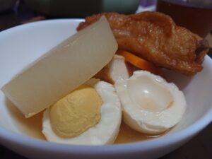 だから、昨日の買い物で大根やてんぷら、厚揚げなんかを買っておいた。そうして、冷やし中華だった昨日の今日の晩ごはんがおでんとなった。
