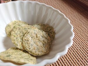 今日のおやつはおとうふチップス。ノンフライ、食べるのに手に油がつかないと娘が大喜び。