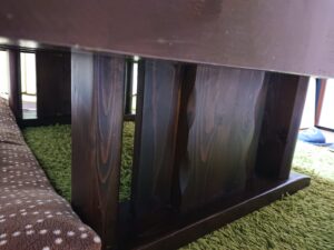 このテーブル、もっと丁寧にお手入れしていたら表面も綺麗なままだったんだろうな。お手入れの方法を学んで、いまからでも大切に使っていこう。この低さが、パソコン作業するのにちょうどいい!背筋を伸ばし、肘が無理なくつく高さ。