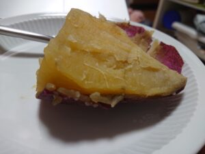 晩ごはんのあとのデザートは、カレーの具となった特大さつまいもの半分を、ストーブの上に鍋をセットして蒸したもの。
