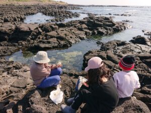 昼前に出かけた海で、3世代おにぎりを頬張る。