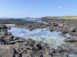 海のゴツゴツ岩を歩いたから足が疲れたけれど、ここちよい。