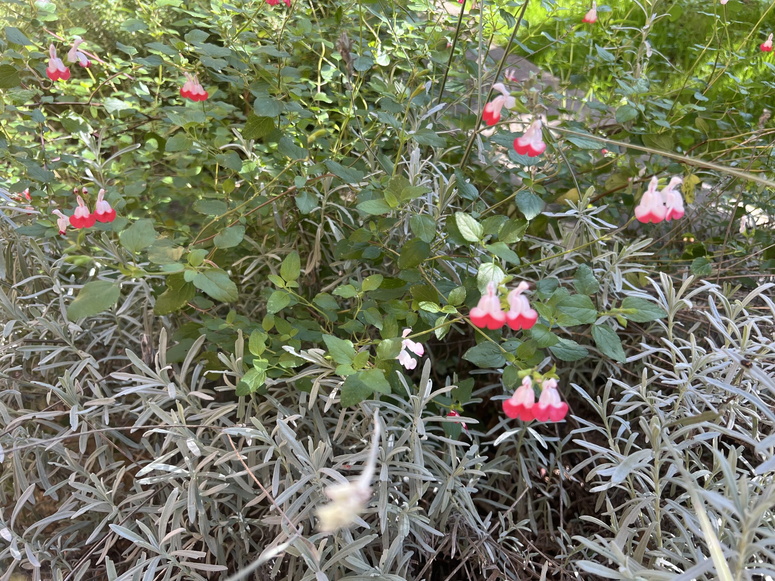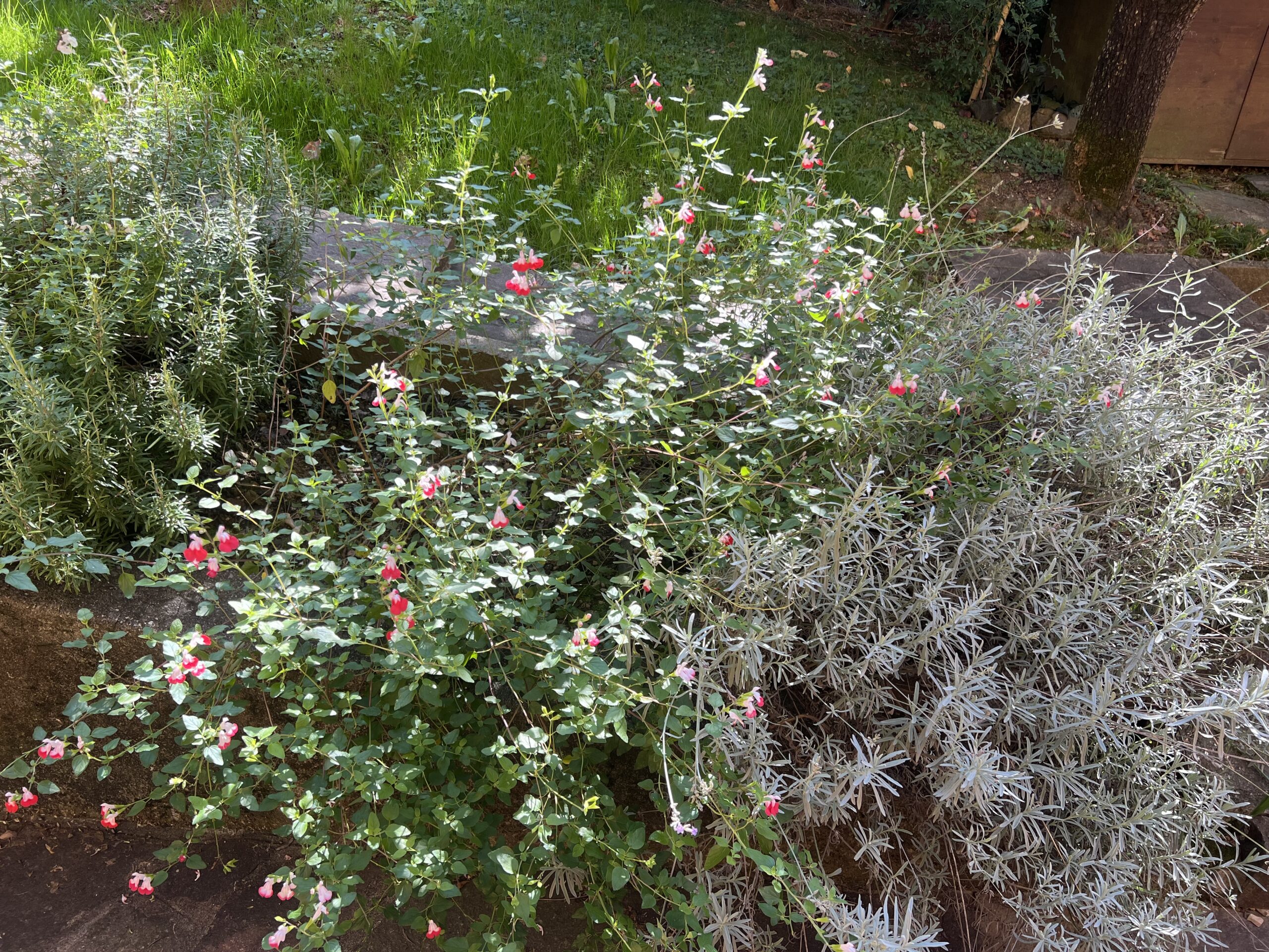 Bathroom の窓からポップなお花が見える時期になった。写真を撮って調べてみたら、ミニセージの花だって。となりの白っぽい草は、ラベンダー。オリーブの木も、こんな乾いたグリーンをしている。ギリシャのアテネの乾いた土地を思い出すグリーン色だ。