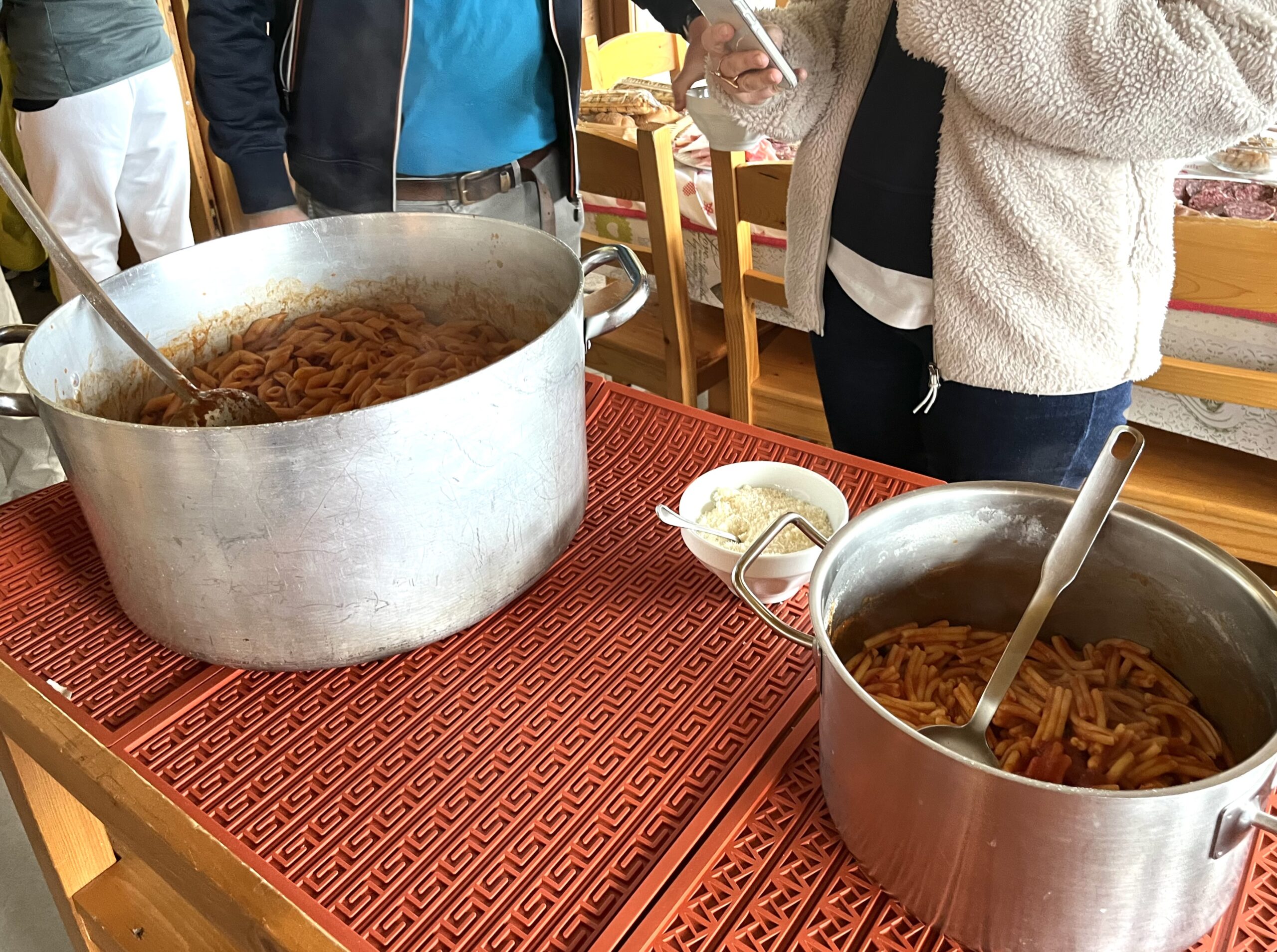 ボランティアのお爺さんとお婆さんが用意してくれた食事。30人分のパスタのお鍋は、とっても素朴で、そしてとても温かかった。