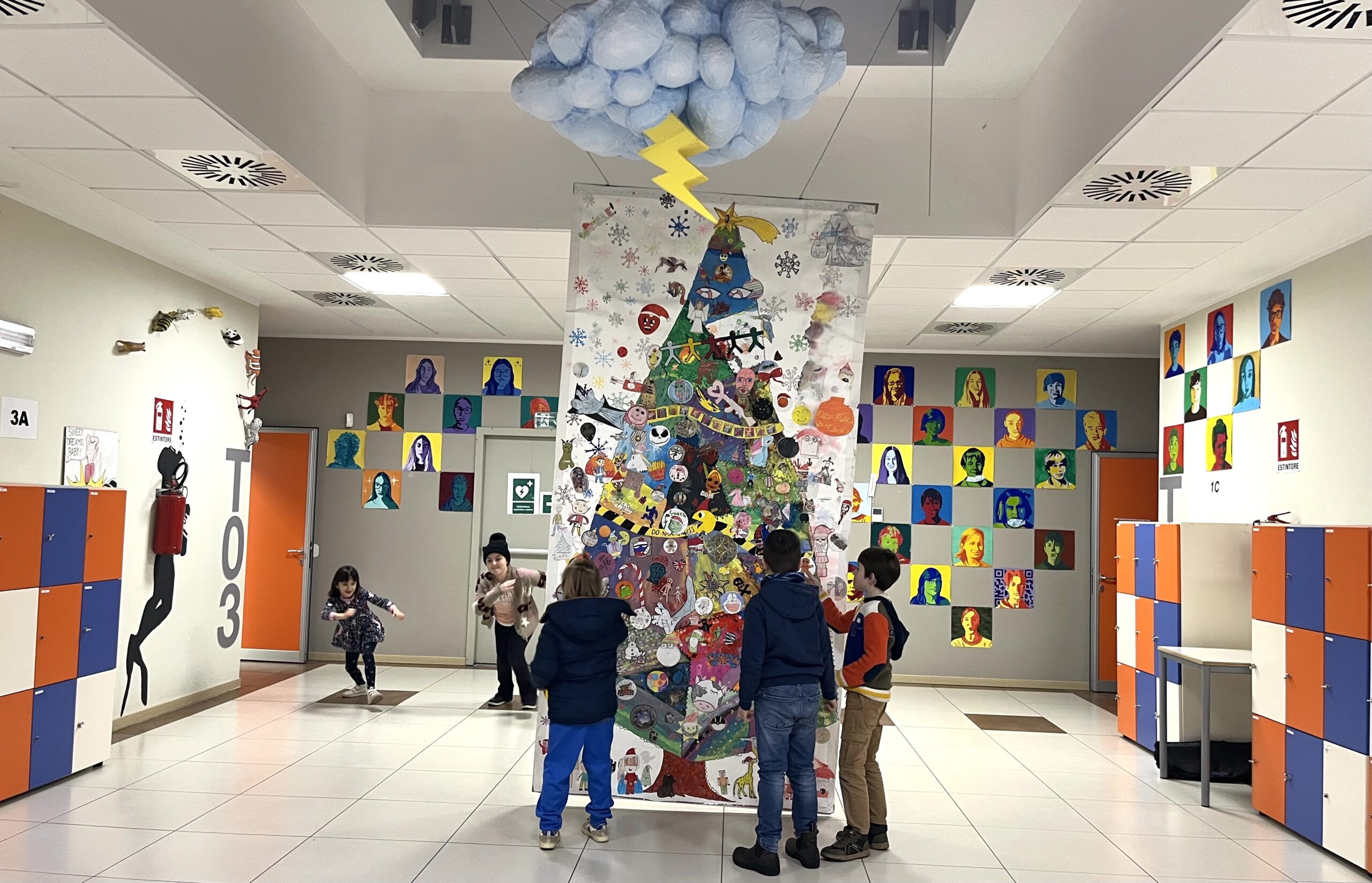 ソフィのカテキズモで訪れる小学校に、絵に描いた背の高いツリーがあってかわいかった。オーナメントも、きっと子どもたちが思い思いに描いて貼ったのだろう。ドラえもんもあってほっこりする。