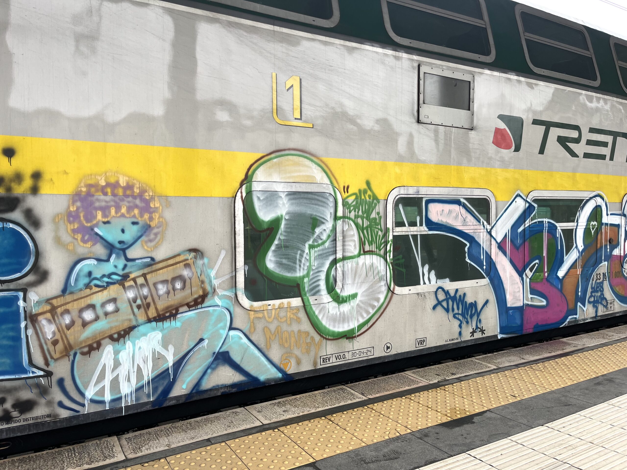 ローカル電車はピカピカのネオン色の新車がいるかと思えば、ぼろっぼろのグラフィティーをまとっている車両があったり。バジェットあるのか無いのか、よくわからないイタリア鉄道。