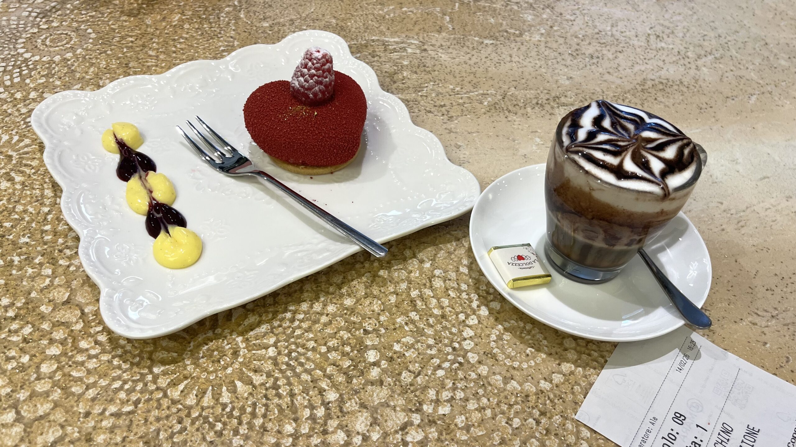 だから、自分にご褒美。ソフィの教会アクティビティの待ち時間にカフェに寄ってみたら、ハートのケーキが。モロッキーノをあわせていただきます。