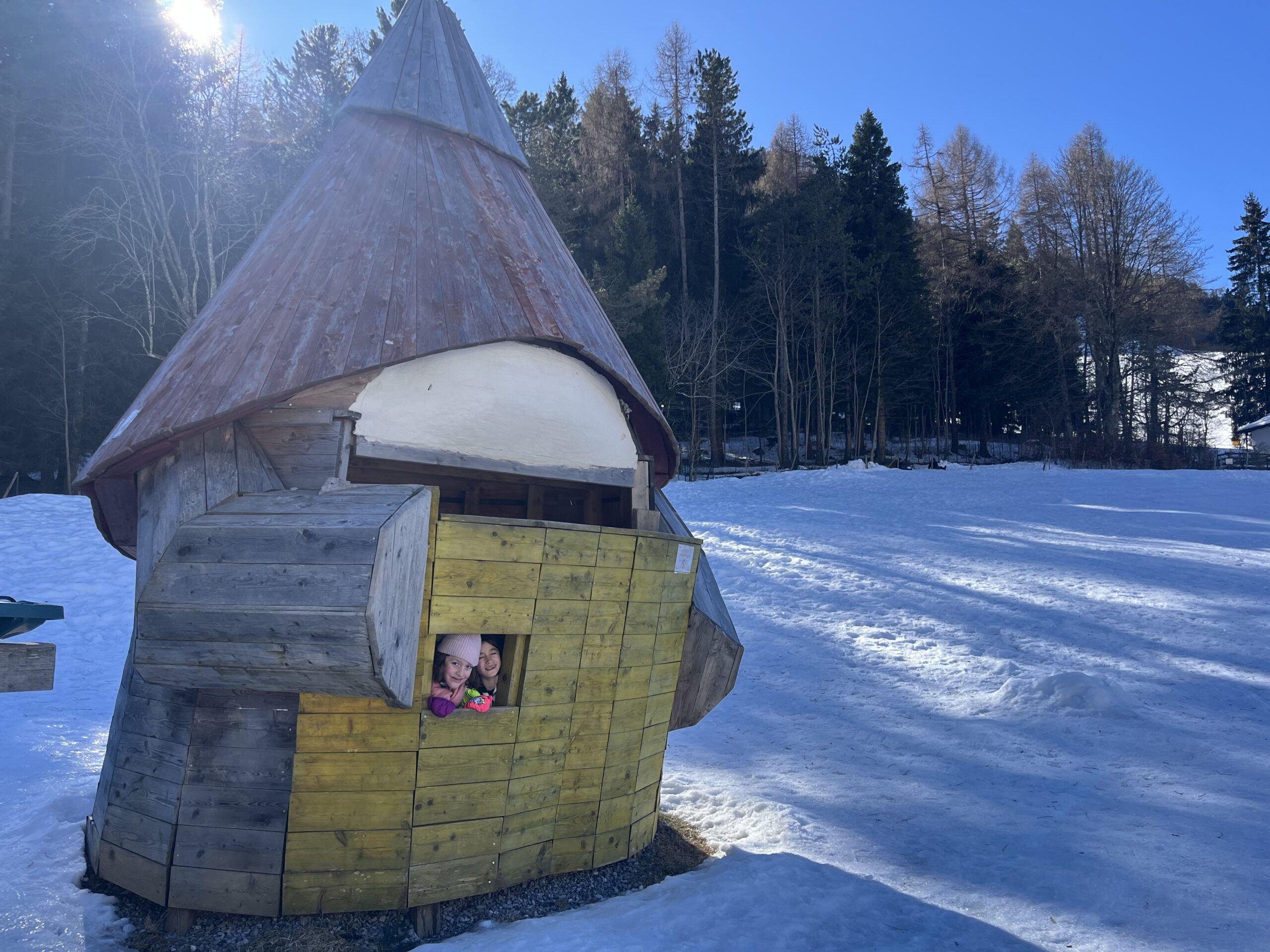 雲ひとつない青空の下でソリをした。朝は風が強くて吹き飛ばされながら、凍った雪の上でツルツル滑りながらだった。一旦カフェ休憩に入り、暖炉の横であったまったら、太陽も出てきてた。