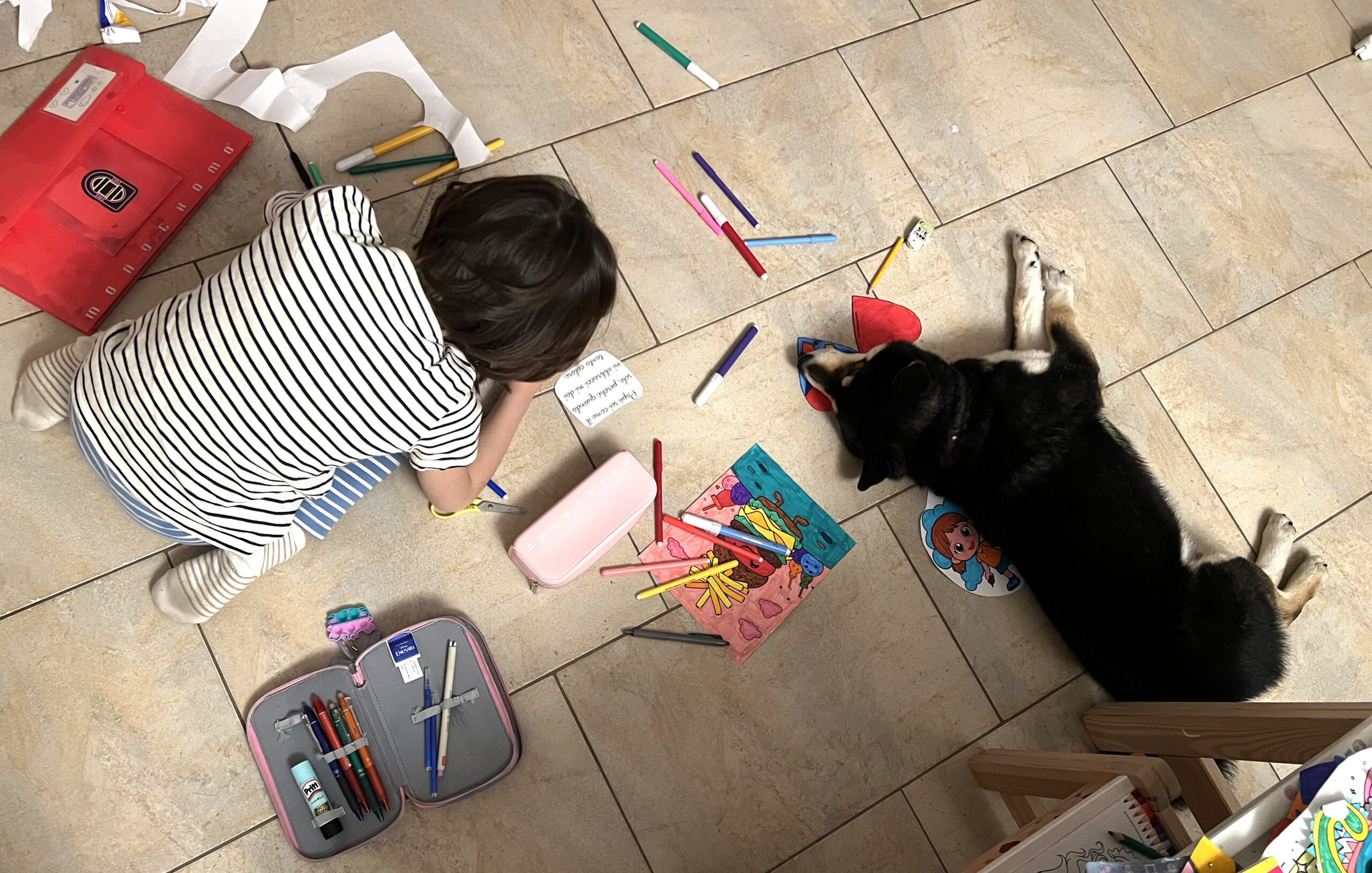 ソフィは全身しましまのコーディネートを朝から嬉々として見せてくれた。靴下も、勿論しましま。相変わらず床に這いつくばり絵を描く横に置かれた作品の上にソレが領域侵入してるのが愛おしい。体調わるわるだったソレも、ようやく鼻が濡れてきていい兆し。ごはんも食べて元気印なうんちもするようになった。嘔吐してから8日くらい回復までかかっている。辛かったろうな。何もしてあげられず、申し訳ない。昨日あたりから、前みたいに腹を見せながら能天気に寝るようになったのを確認して、ようやくわたしも安心できた。