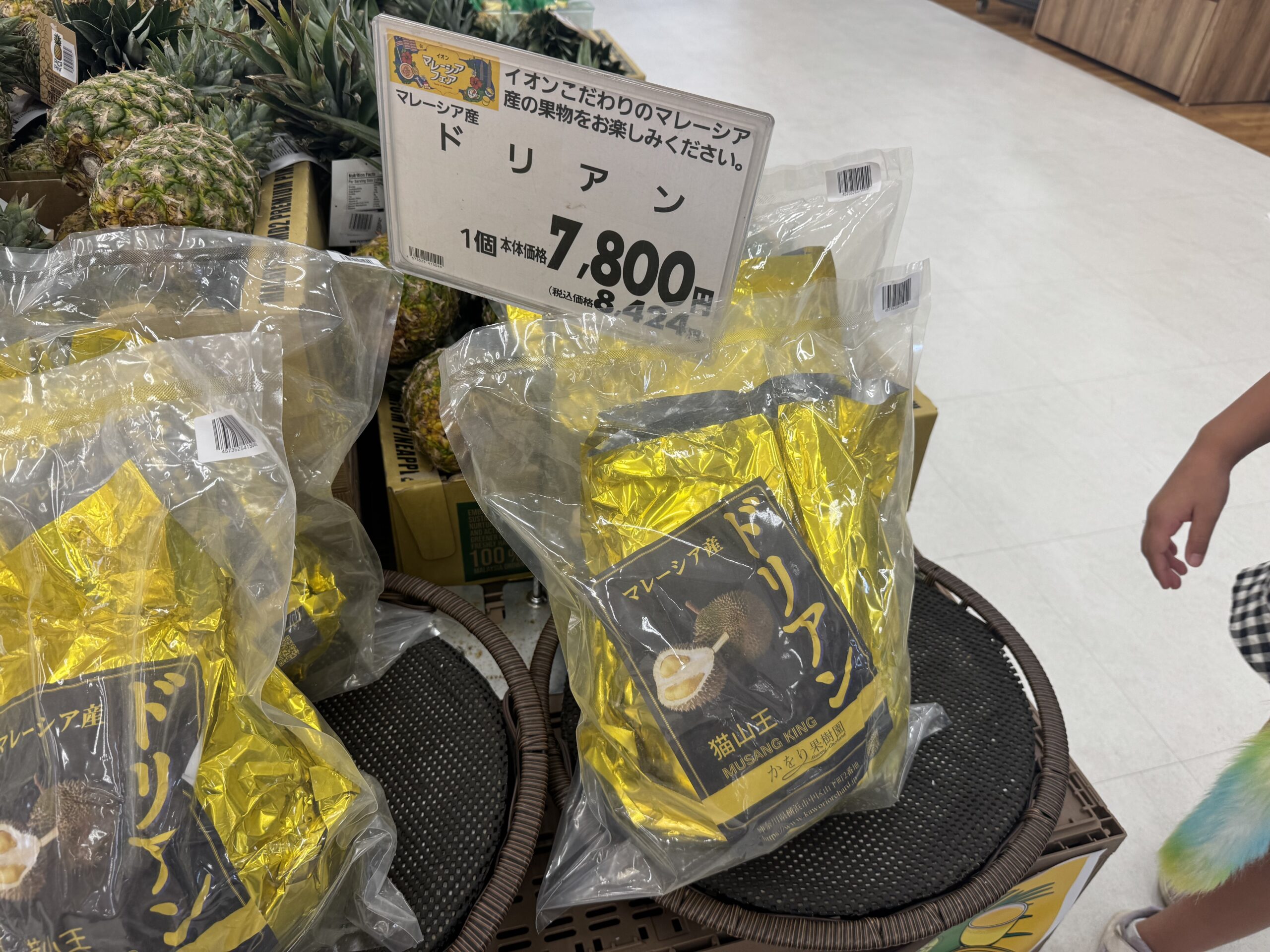 ちょっと街に出たところのイオンで、ドリアン丸ごと売ってた!衝撃的でついつい写真撮った。すごい値段も高いし、どういう人が買っていくのだろうか。ちょっと隠れて見てみたい。