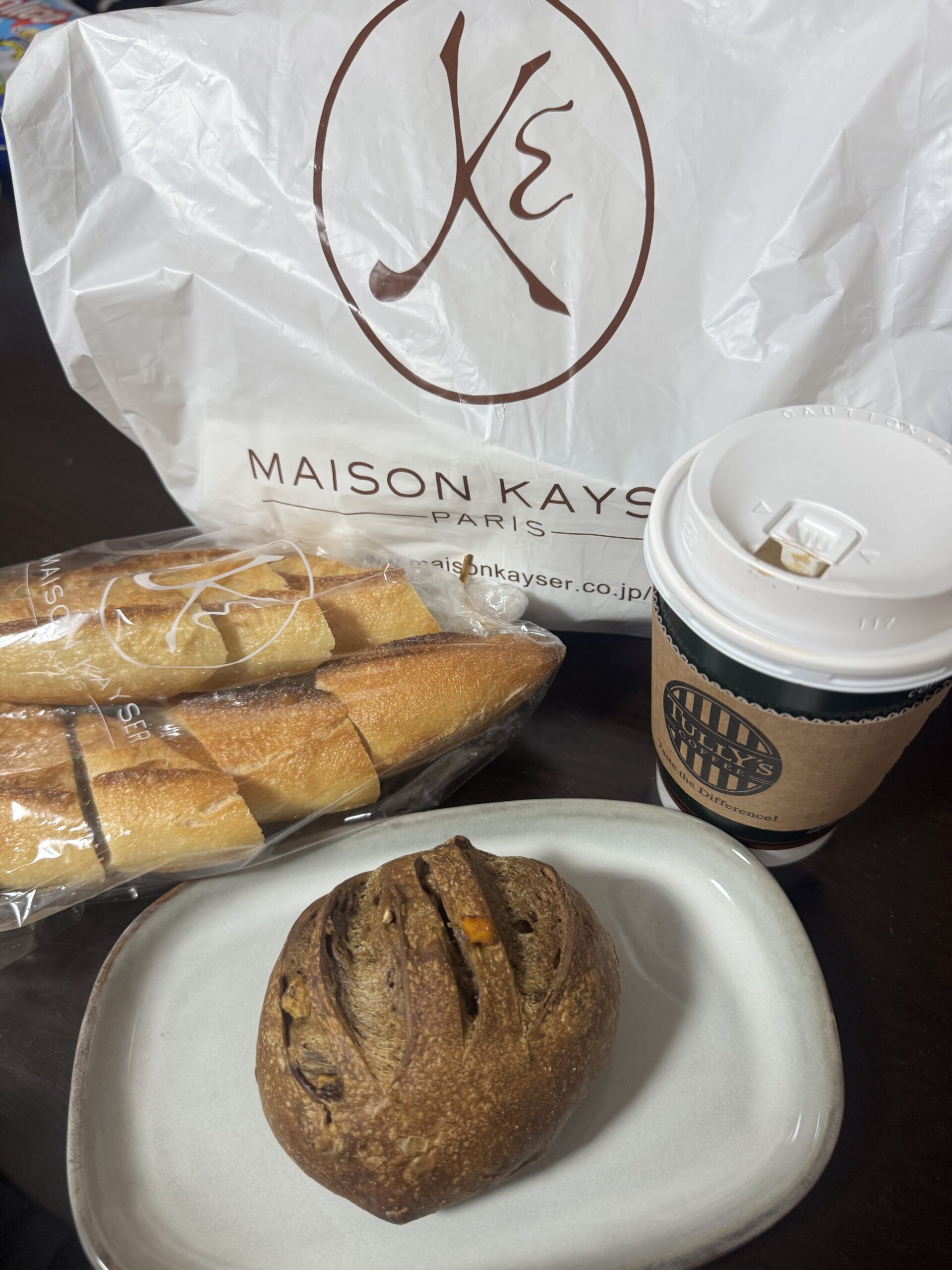帰りにメゾンカイザーでパンとタリーズでカフェラテ買って帰った。これまた久しぶりのメゾンカイザーのパン美味しいな。パリジェンヌみたいにおしゃれにバゲットを1本買って帰りたいところだが、切ってあるのをついつい手にしてしまう私。そういうところね。おしゃれ生活になれないところは。