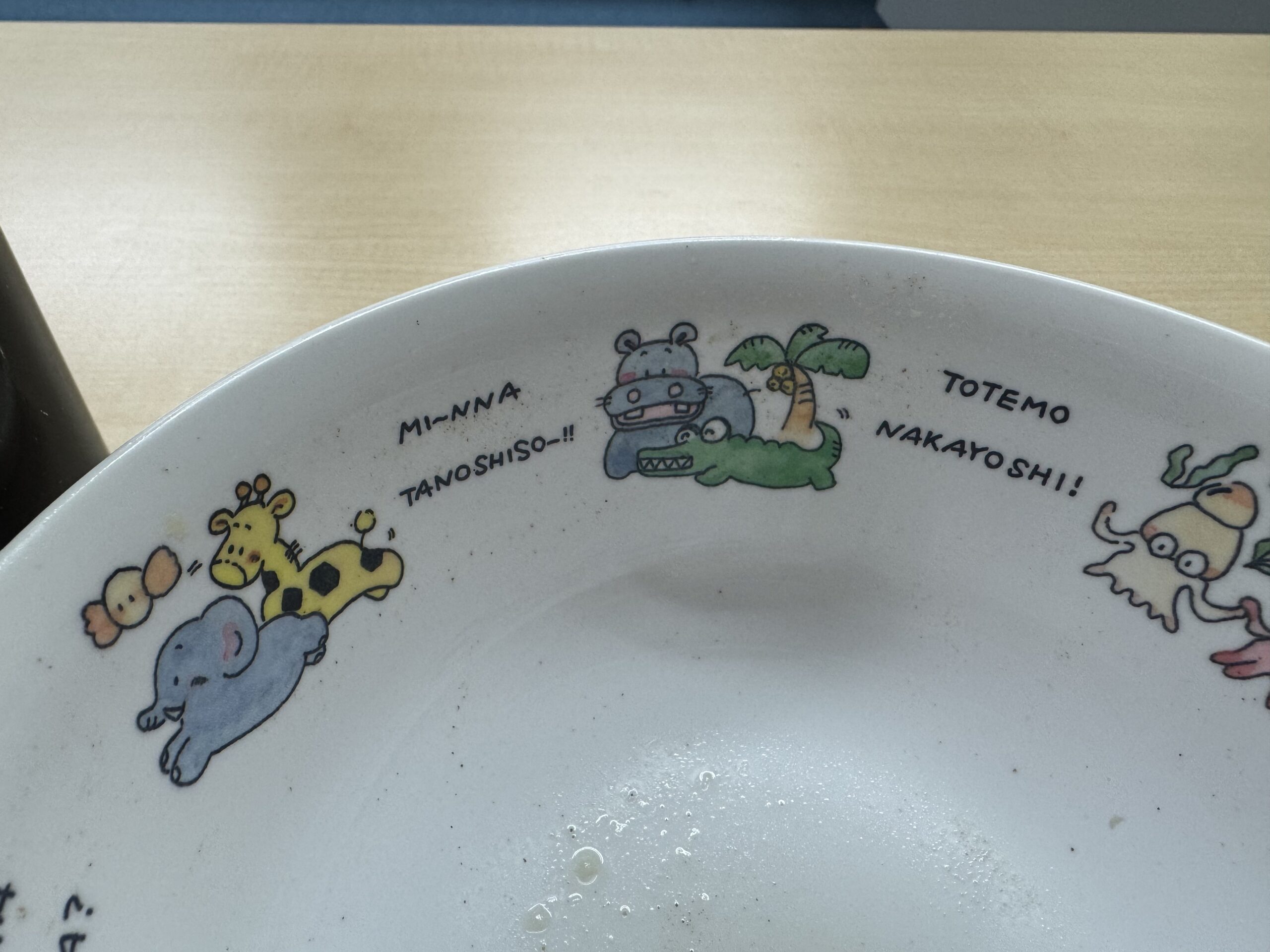 この日本語をローマ字にしてあるやつ。昭和感がすごい。同じ食器を持っていたわけではないが、きっとこのフォーマットは溢れていたような気がする。なんか面白くてついつい写真を撮ってしまった。食べた後の汚い食器をごめんなさい。