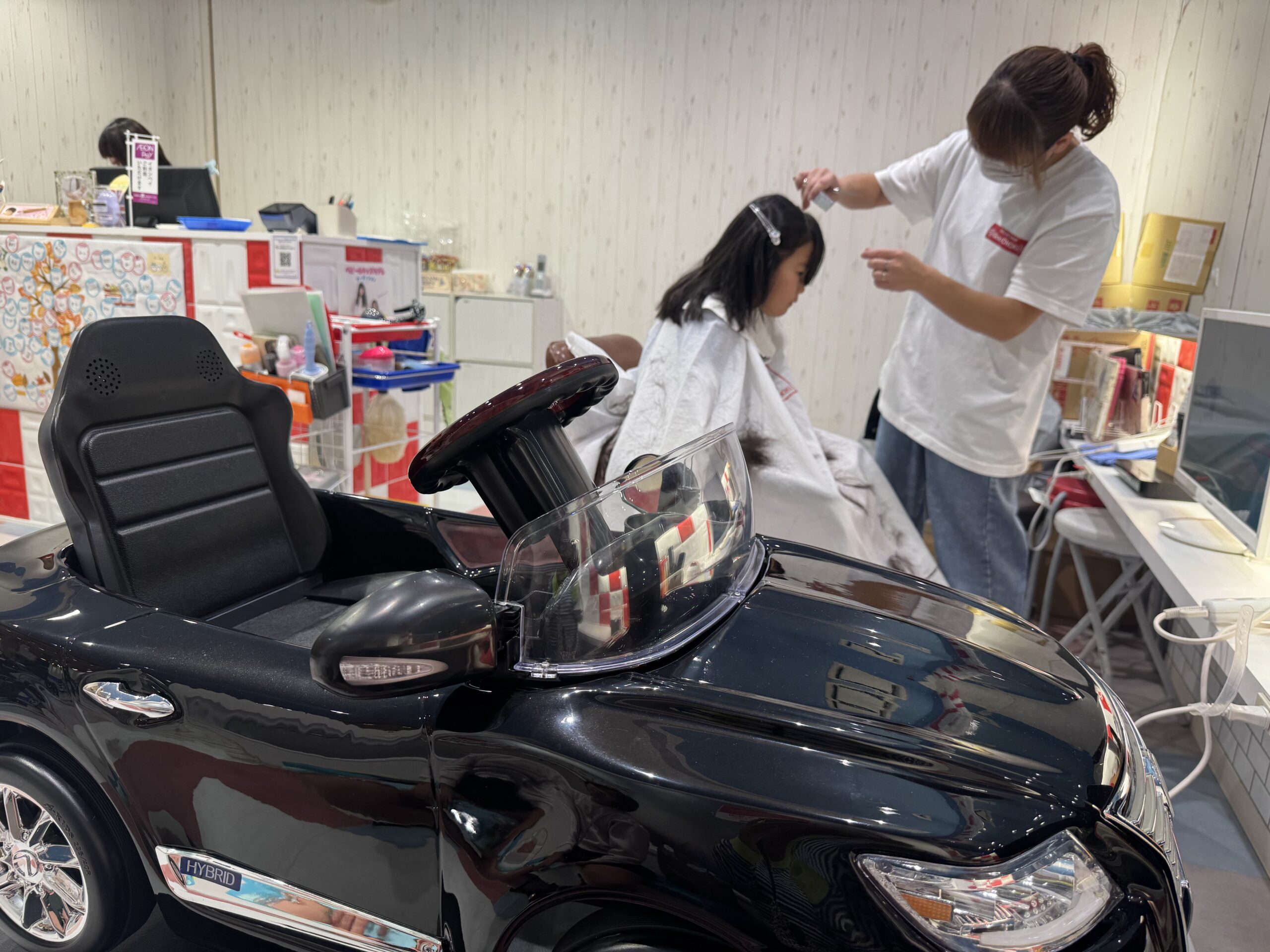 出来はご希望通りにできて満足のようだった。前にこちらにカットしに来た時は、この車に喜んで乗っていたが、もう今回は普通の椅子に座るとのことで。成長したのね。