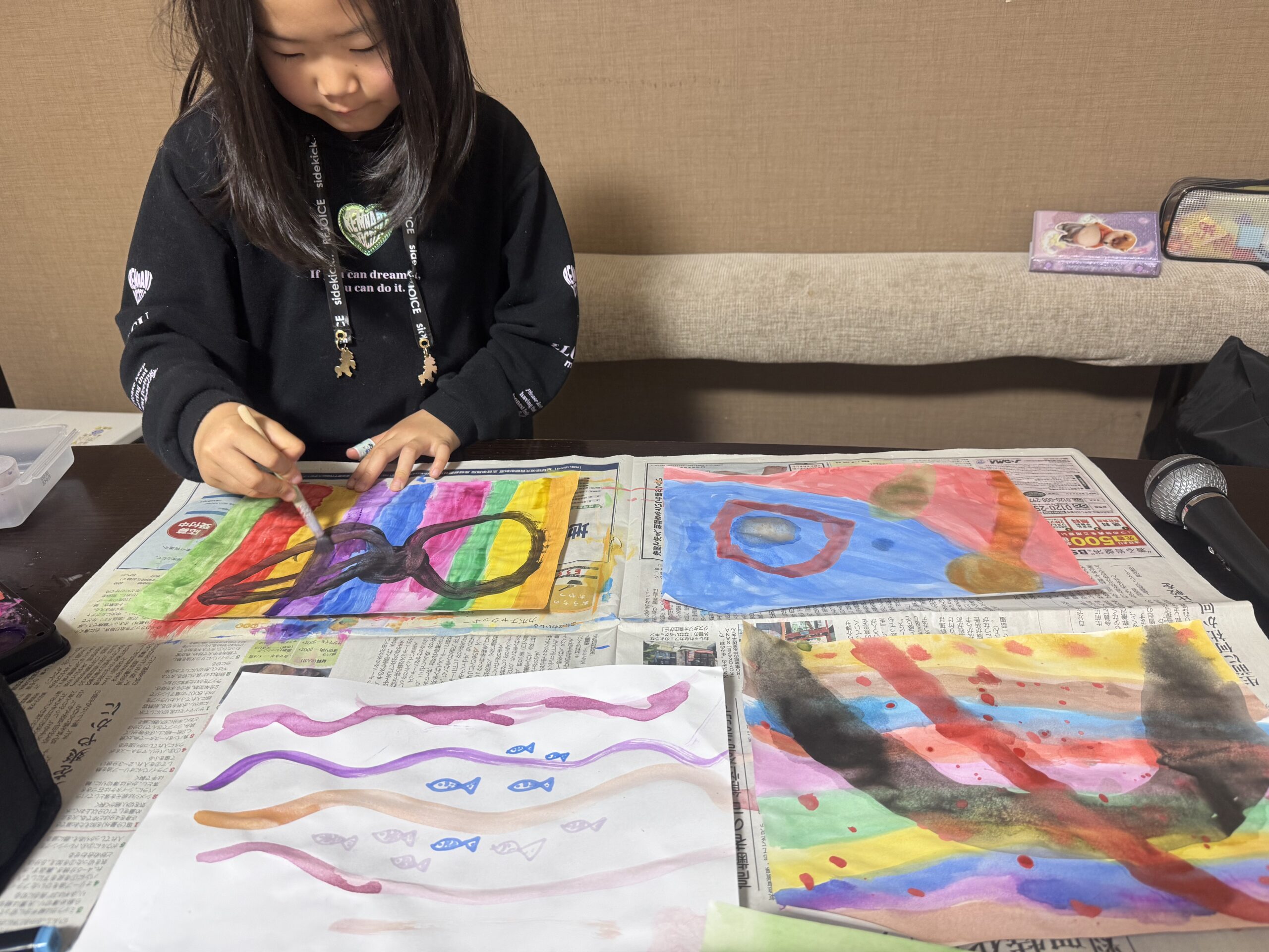 帰ってからは、次女画伯の制作意欲が出て、IKEAの溶かす絵の具で自由なものを書いていた。
