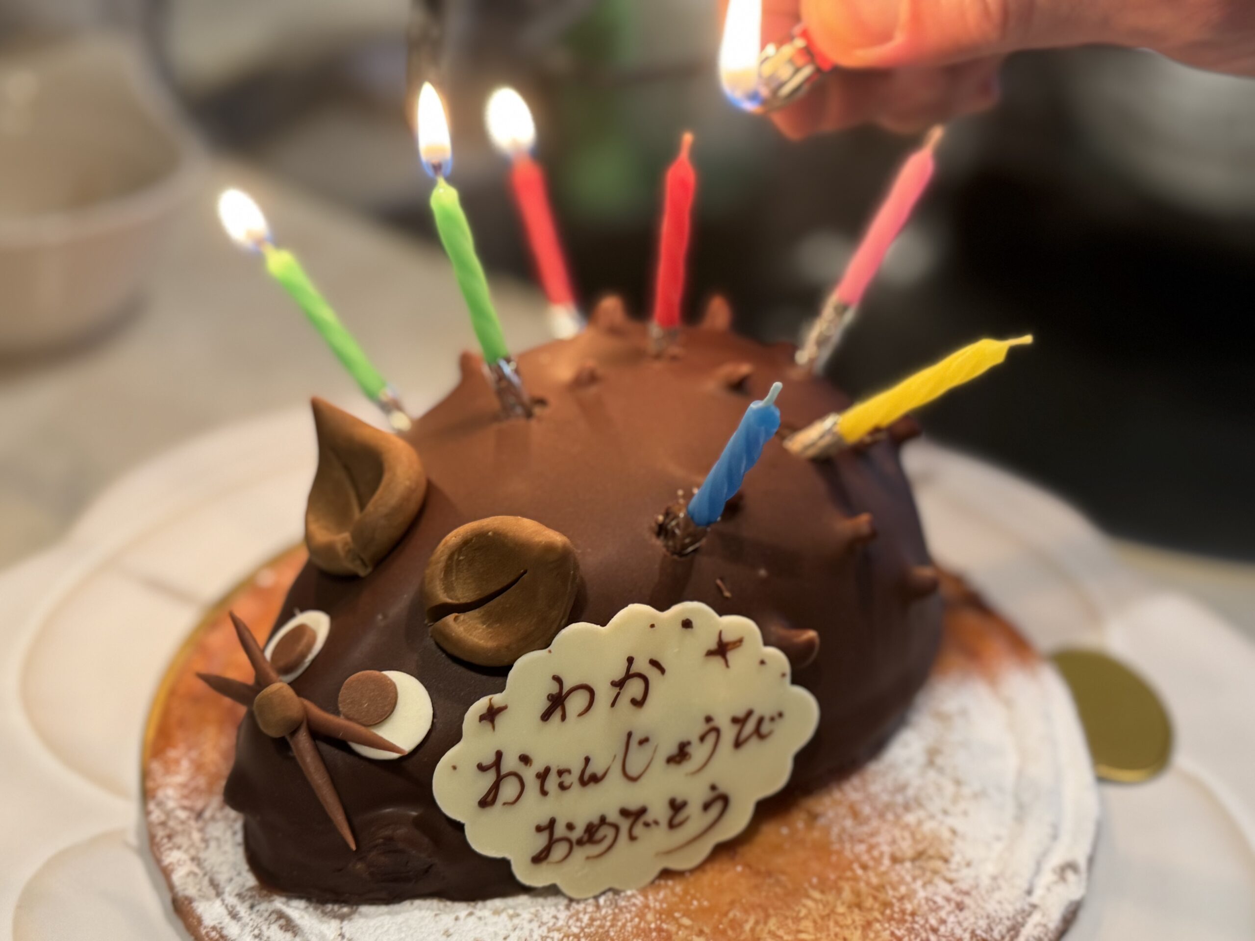『ガトーのエリソン』という名のケーキ。エリソンって絵本か何かにある名前なのかなと思って調べたら、フランス語でハリネズミをエリソンというらしい。フランスではハリネズミは縁起の良い動物だそうだ。それにしてもめちゃ可愛いケーキが買えた。次女もとても喜んでいた。蝋燭を吹き消した途端、目、耳、鼻、髭が娘たちにあっという間に奪われた。おかげで心傷まず切り分けられました。見た目の可愛さで勝負だったので、味は期待していなかったが、オレンジ風味も入ったチョコケーキで大人も美味しく食べられて満足度高し。少し足を伸ばして人気店へ行ってみてよかった。
